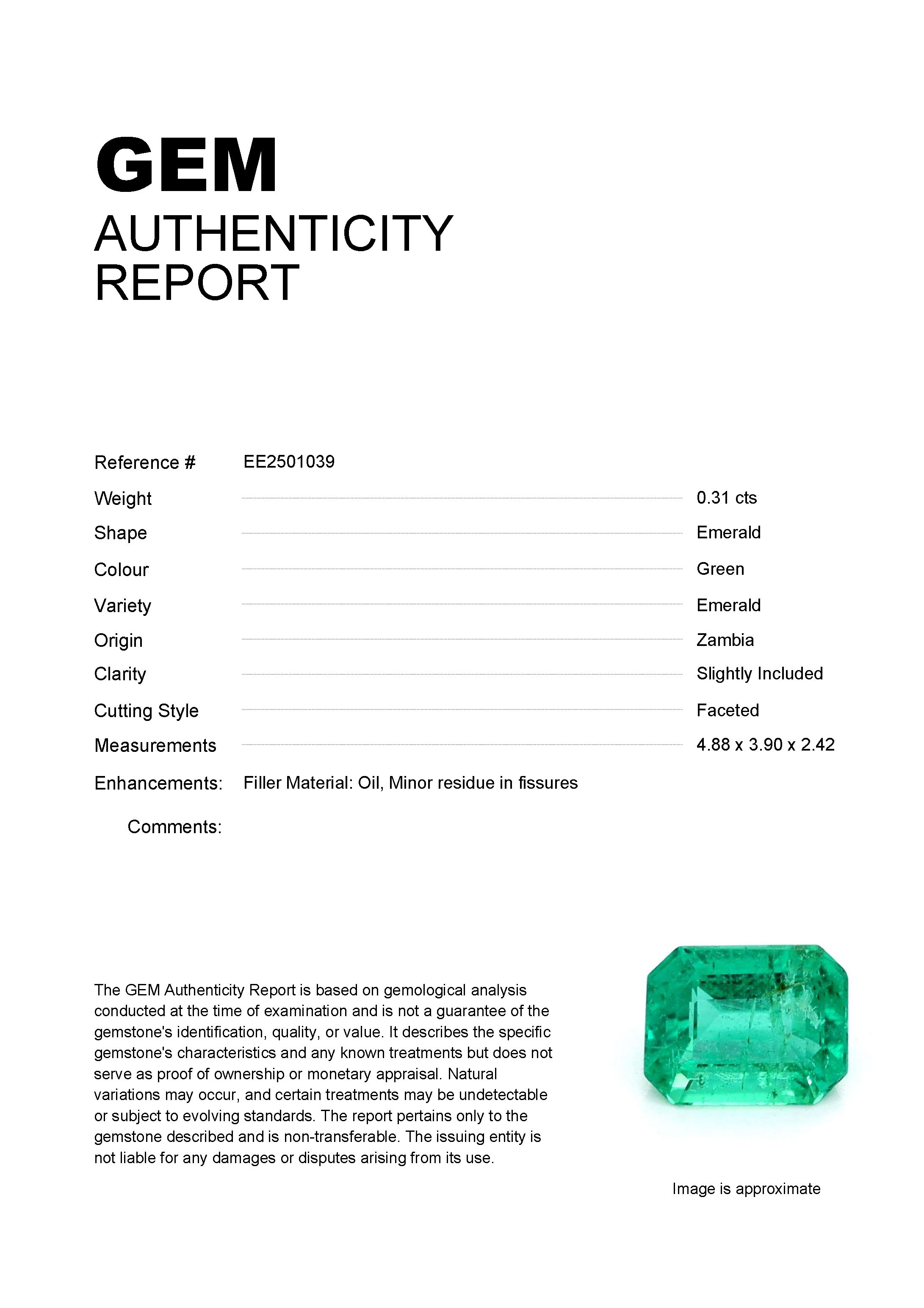 0.31ct Green Emerald Zambia EmeraldCarat: 0.31 ctType: EmeraldCut: EmeraldColour: GreenOrigin: ZambiaComment: Not Heated,