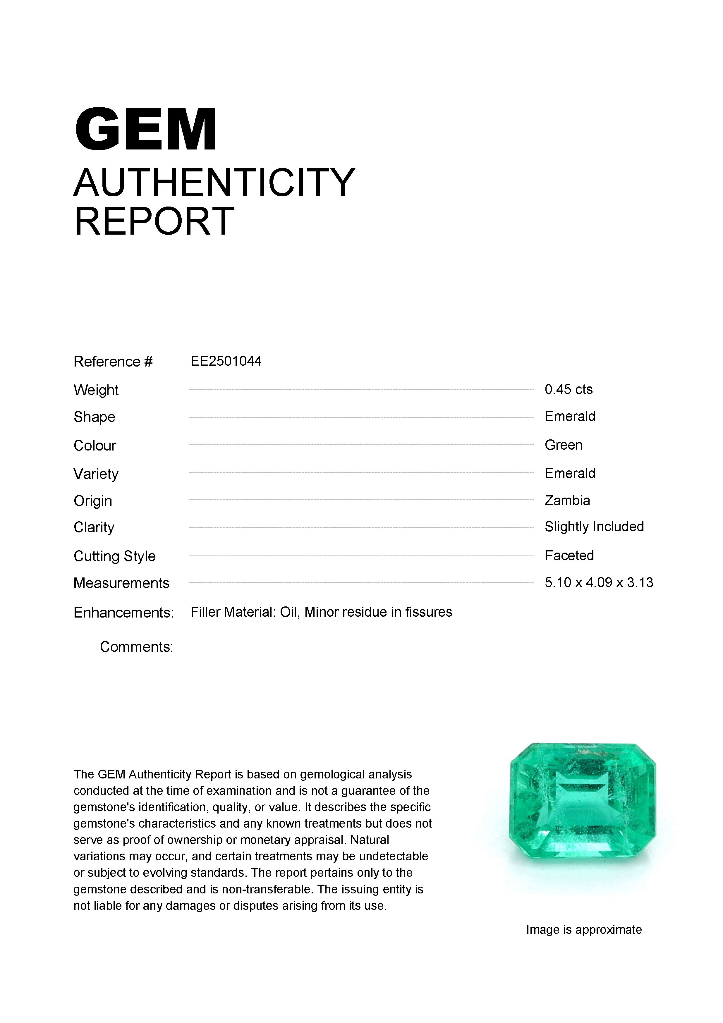 0.45ct Green Emerald Zambia EmeraldCarat: 0.45 ctType: EmeraldCut: EmeraldColour: GreenOrigin: ZambiaComment: Not Heated,