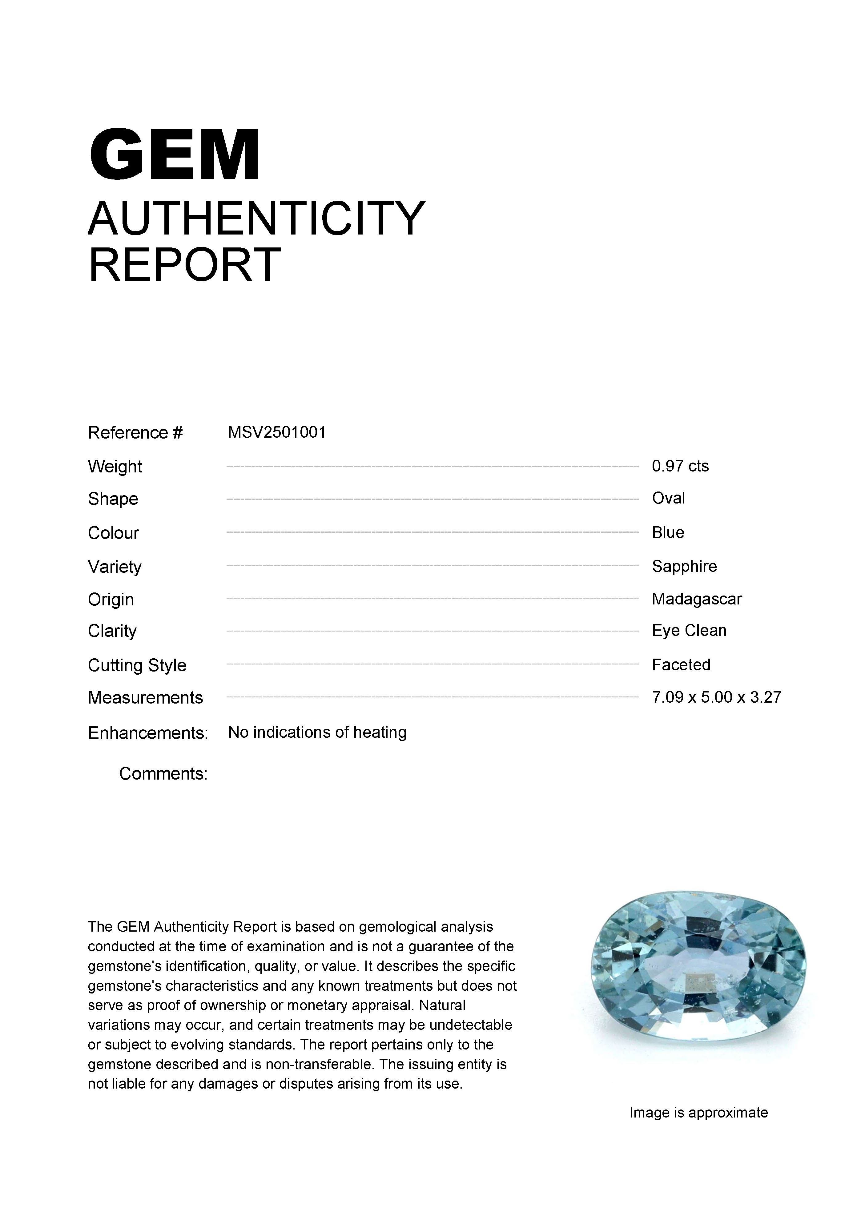 GEM: MSV2501001 Stock ID: MSV25010010.97ct Blue Oval Madagascar SapphireCarat: 0.97 ctType: SapphireCut: OvalColour: BlueOrigin: MadagascarComment: Not Heated7.09 x 5.00 x 3.27 mm