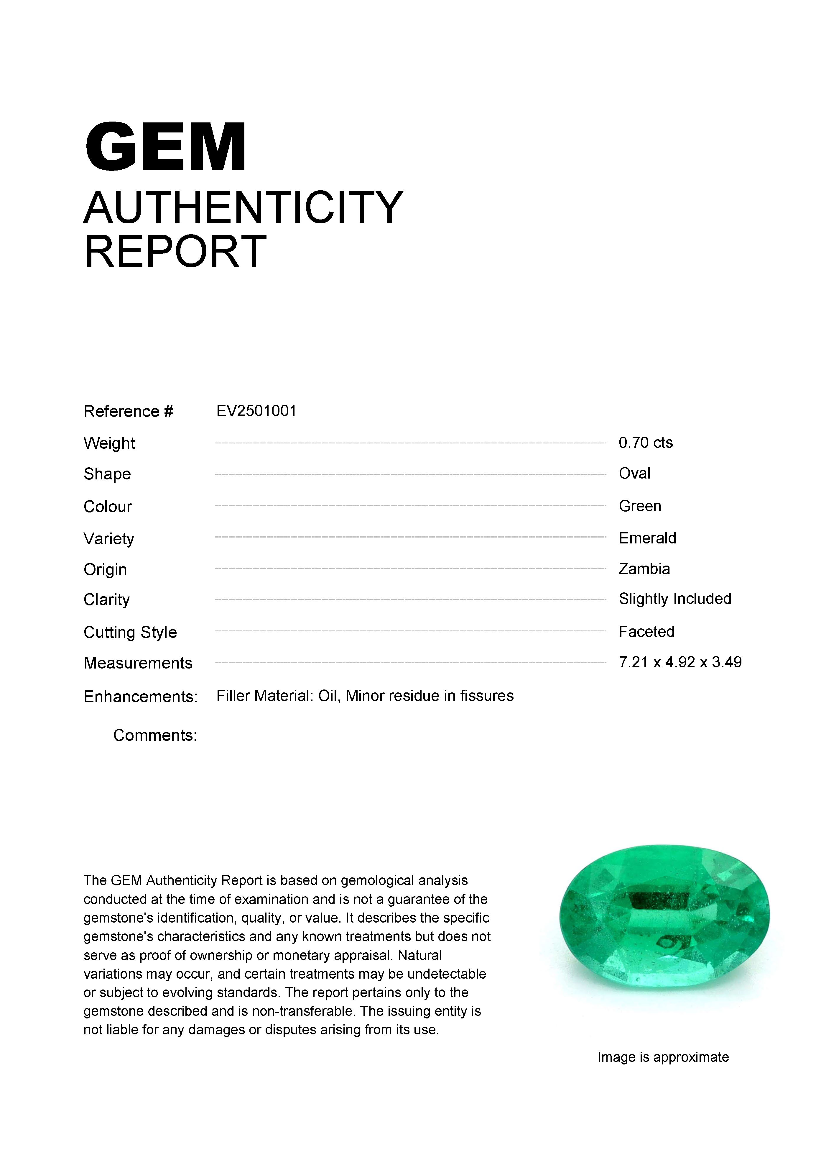 0.70ct Green Oval Zambia EmeraldCarat: 0.70 ctType: EmeraldCut: OvalColour: GreenOrigin: ZambiaComment: Not Heated,