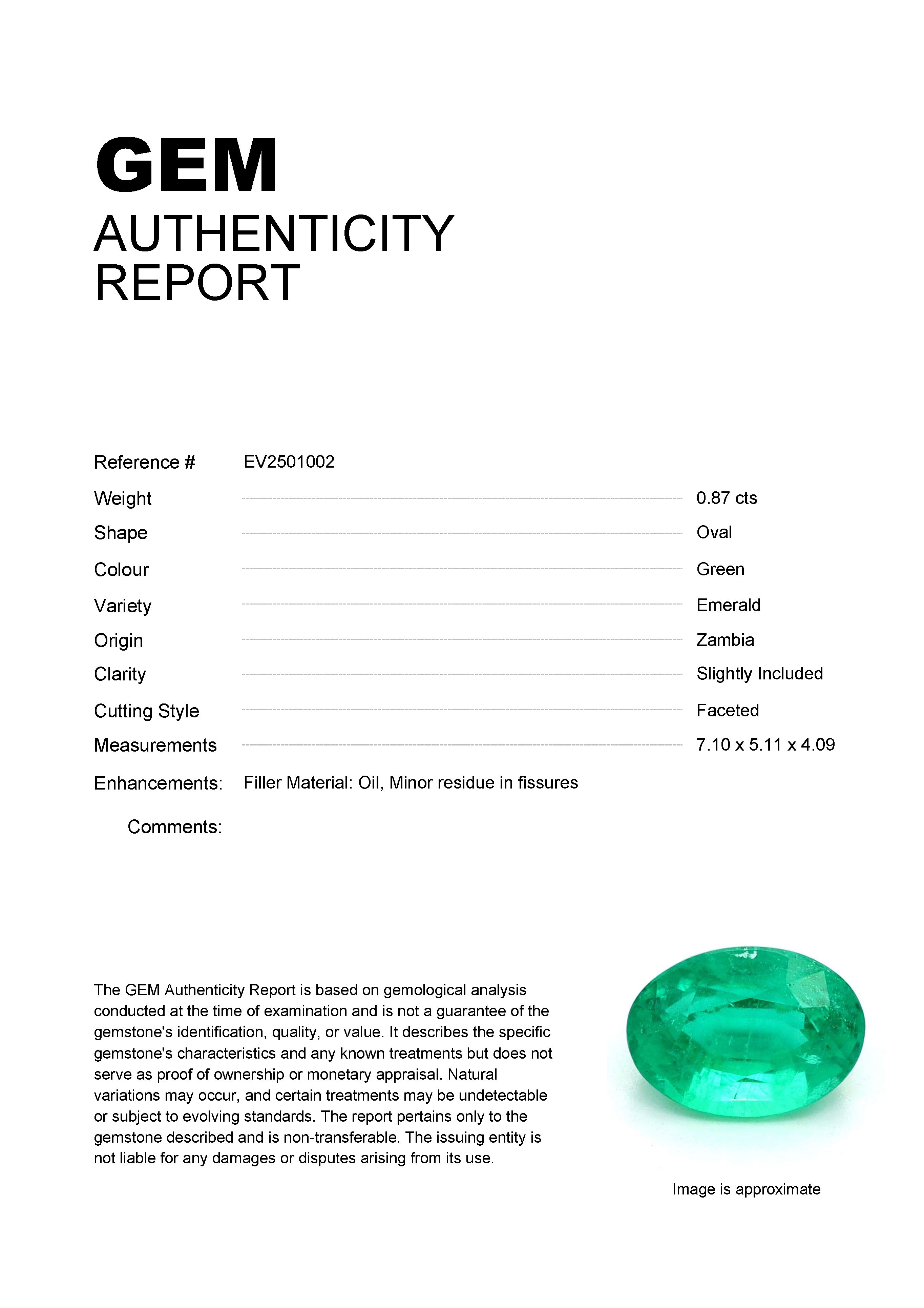 0.87ct Green Oval Zambia EmeraldCarat: 0.87 ctType: EmeraldCut: OvalColour: GreenOrigin: ZambiaComment: Not Heated,