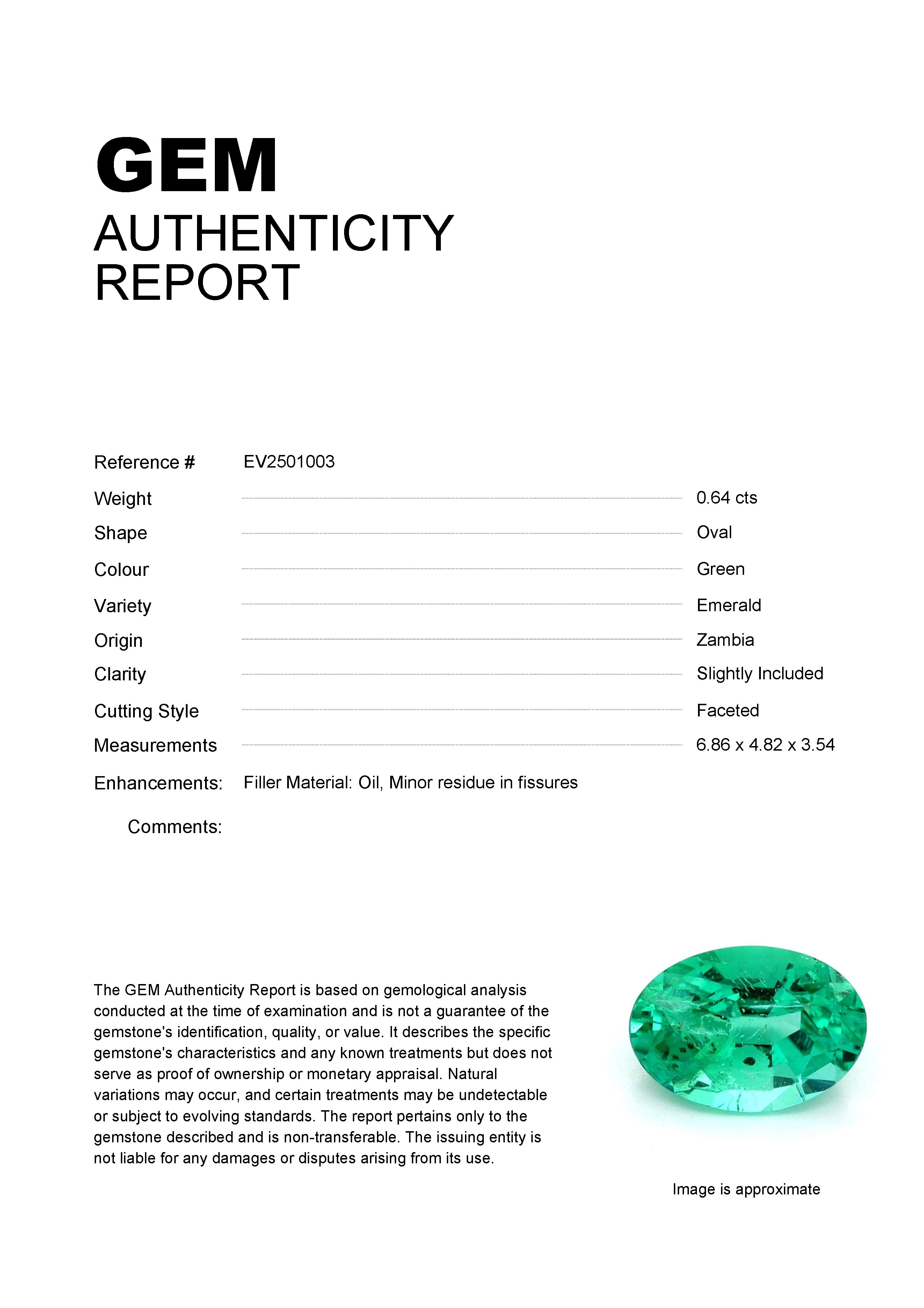 0.64ct Green Oval Zambia EmeraldCarat: 0.64 ctType: EmeraldCut: OvalColour: GreenOrigin: ZambiaComment: Not Heated,