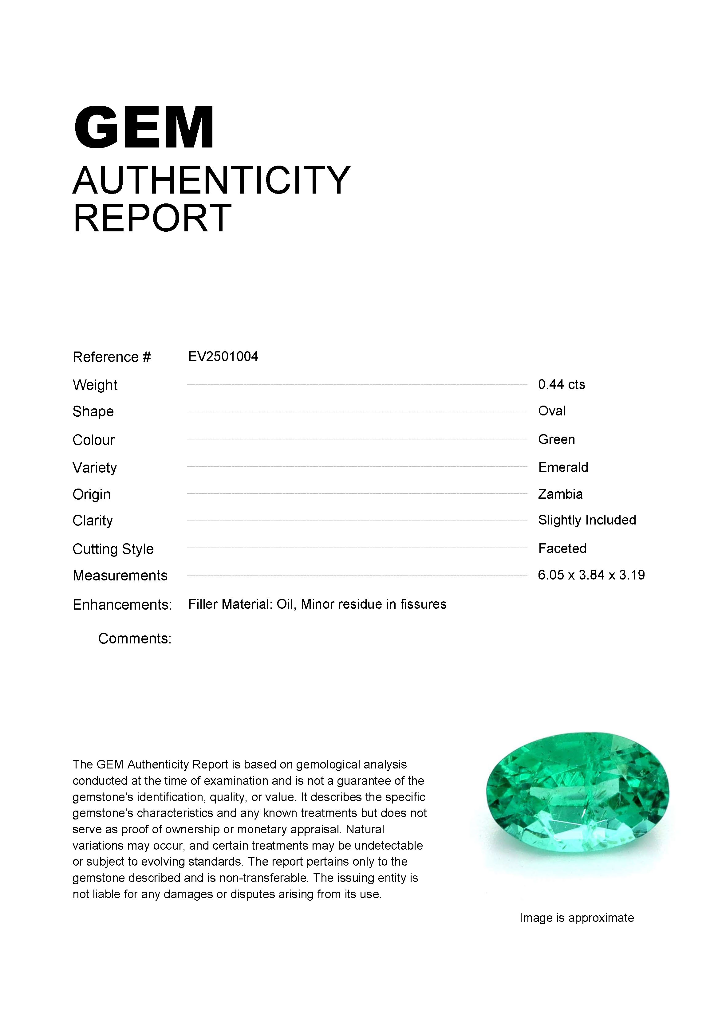 0.44ct Green Oval Zambia EmeraldCarat: 0.44 ctType: EmeraldCut: OvalColour: GreenOrigin: ZambiaComment: Not Heated,