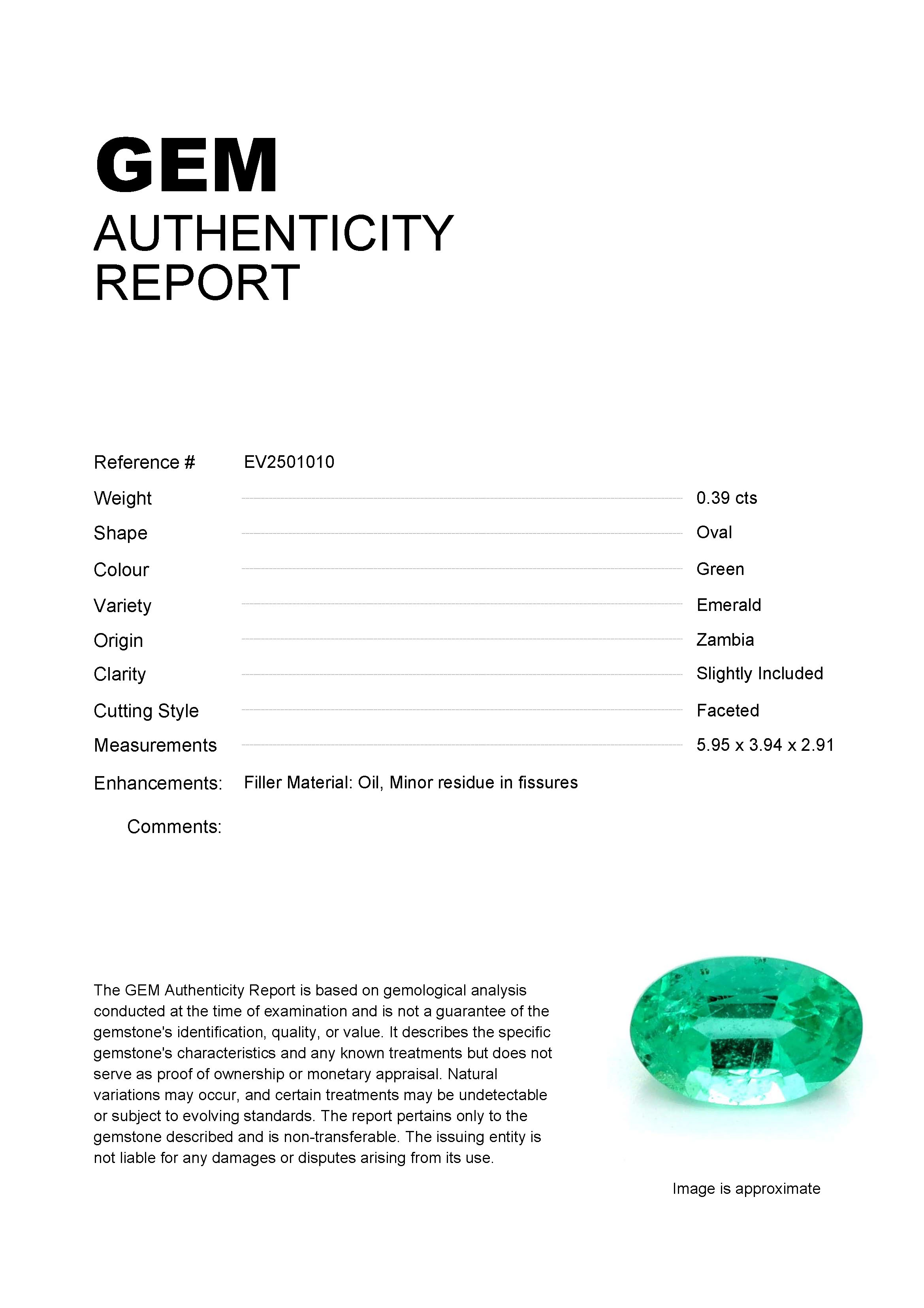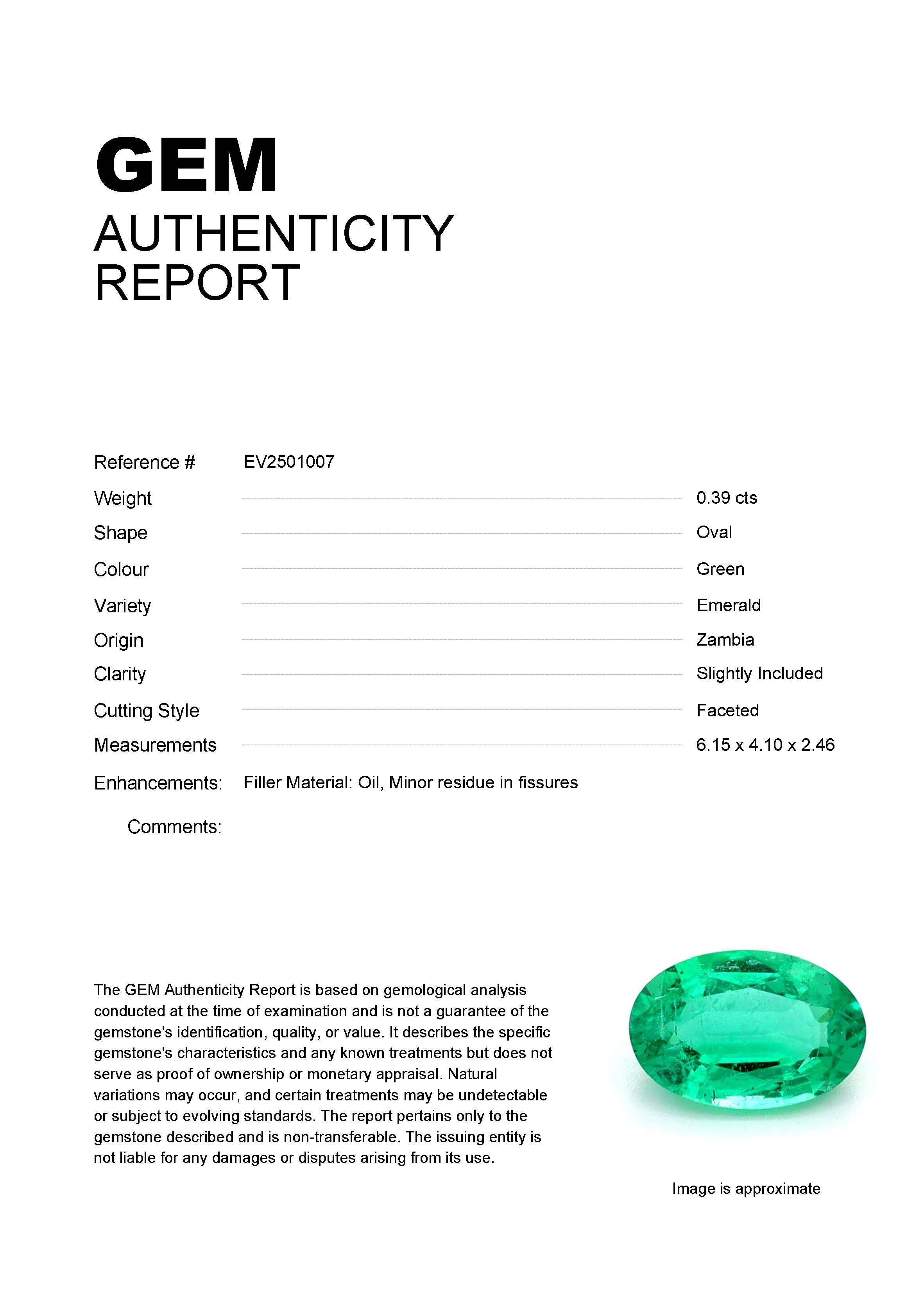 0.39ct Green Oval Zambia EmeraldCarat: 0.39 ctType: EmeraldCut: OvalColour: GreenOrigin: ZambiaComment: Not Heated,
