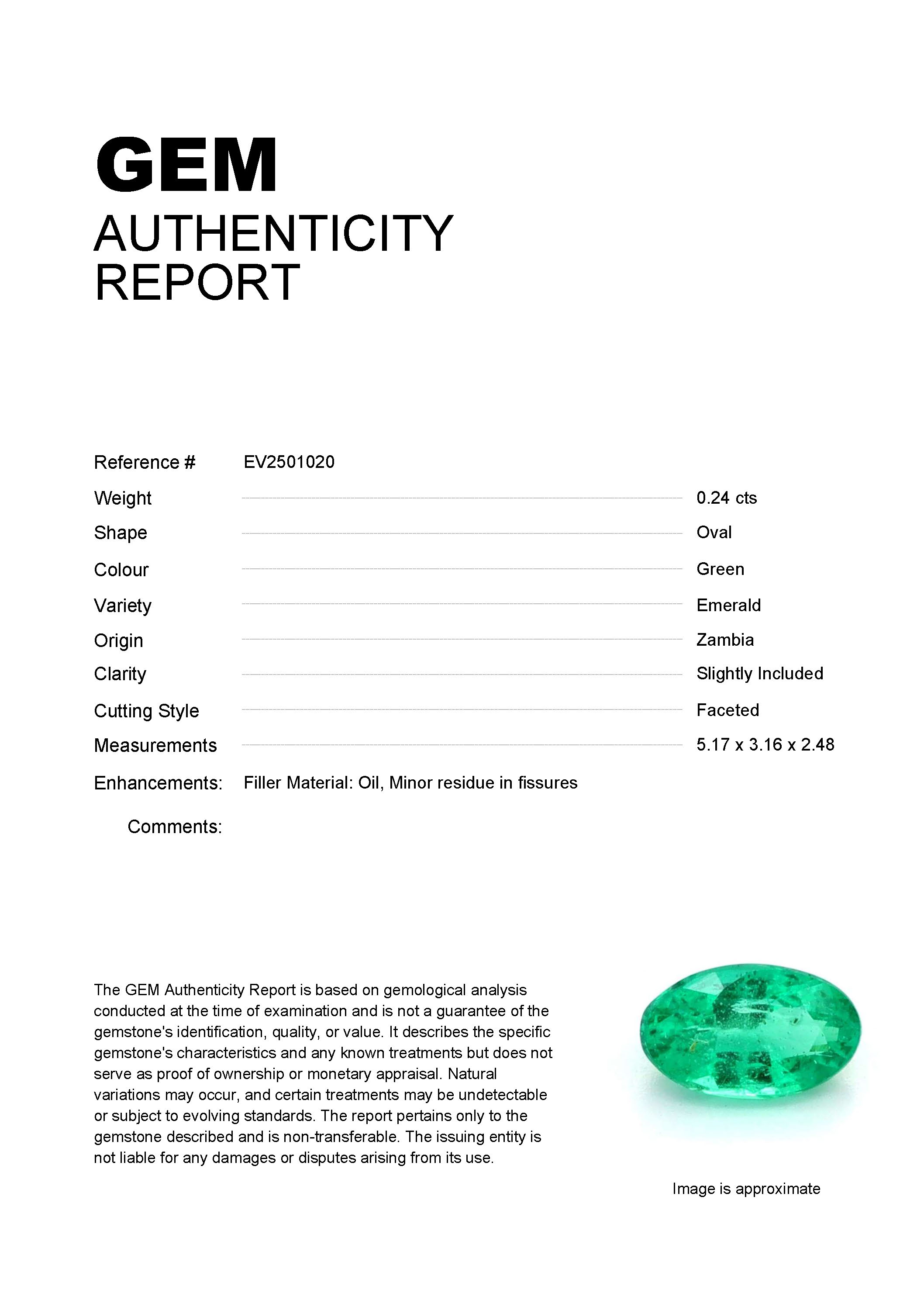 0.24ct Green Oval Zambia EmeraldCarat: 0.24 ctType: EmeraldCut: OvalColour: GreenOrigin: ZambiaComment: Not Heated,