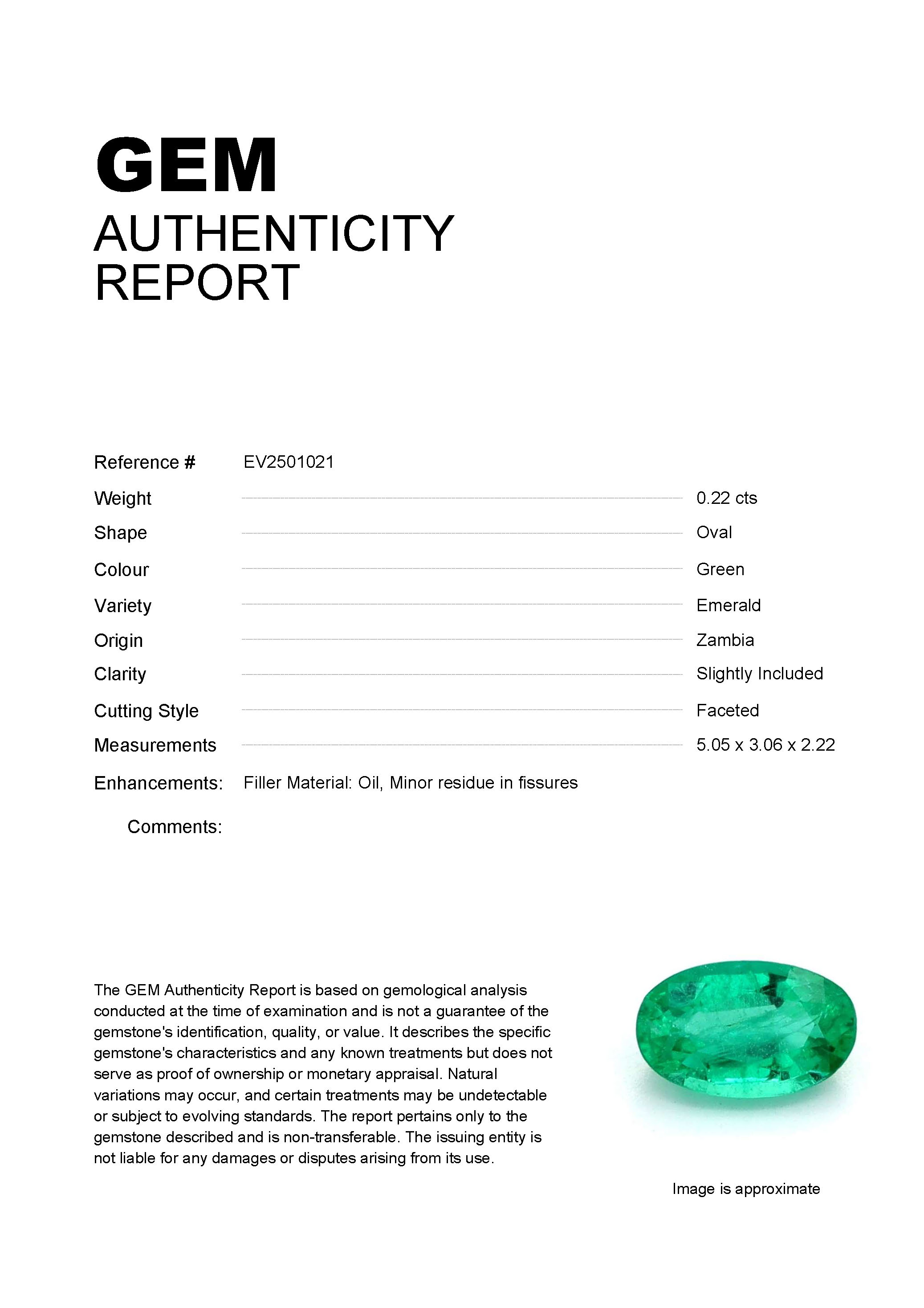 0.22ct Green Oval Zambia EmeraldCarat: 0.22 ctType: EmeraldCut: OvalColour: GreenOrigin: ZambiaComment: Not Heated,