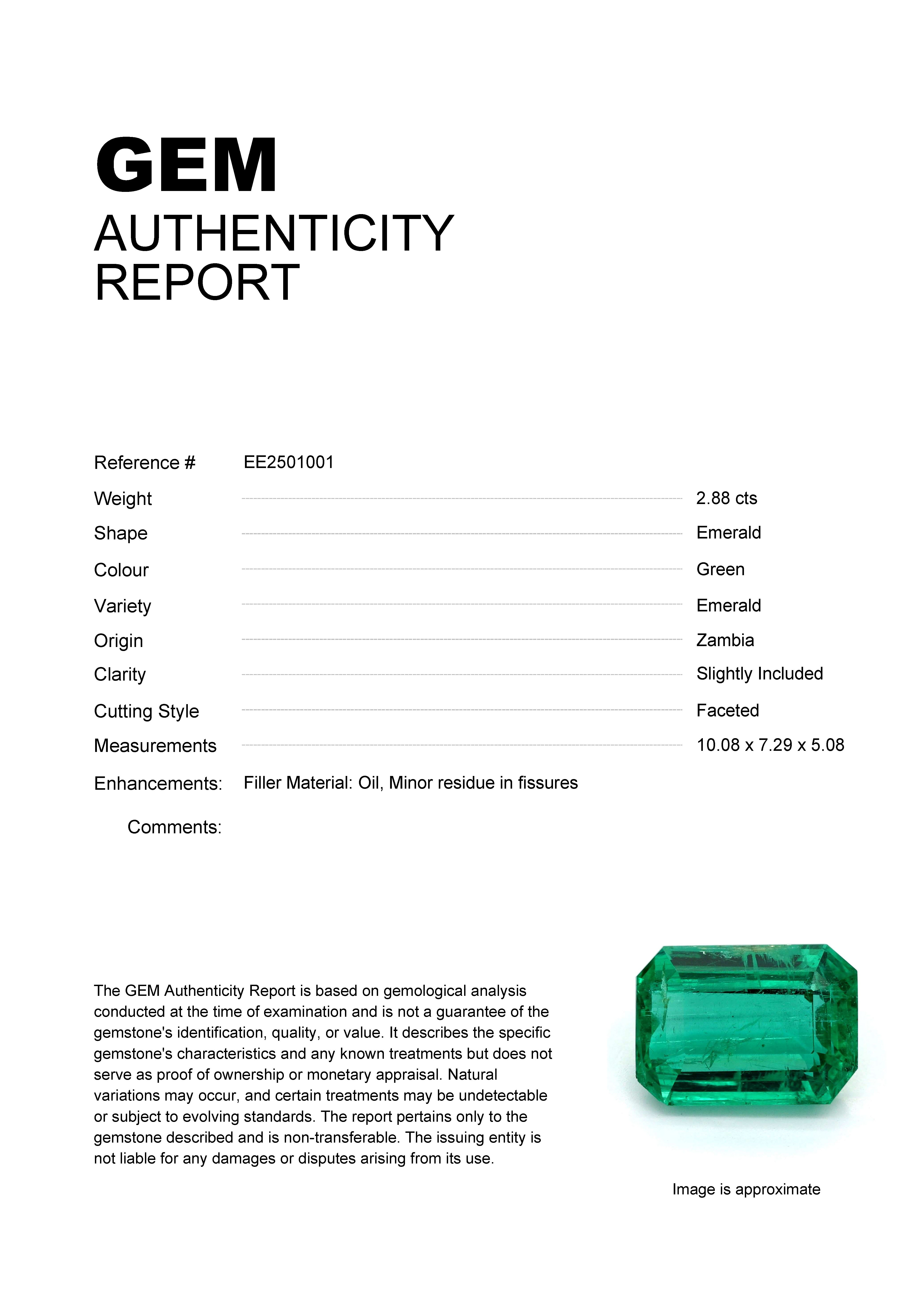 2.88ct Green Emerald Zambia EmeraldCarat: 2.88 ctType: EmeraldCut: EmeraldColour: GreenOrigin: ZambiaComment: Not Heated,