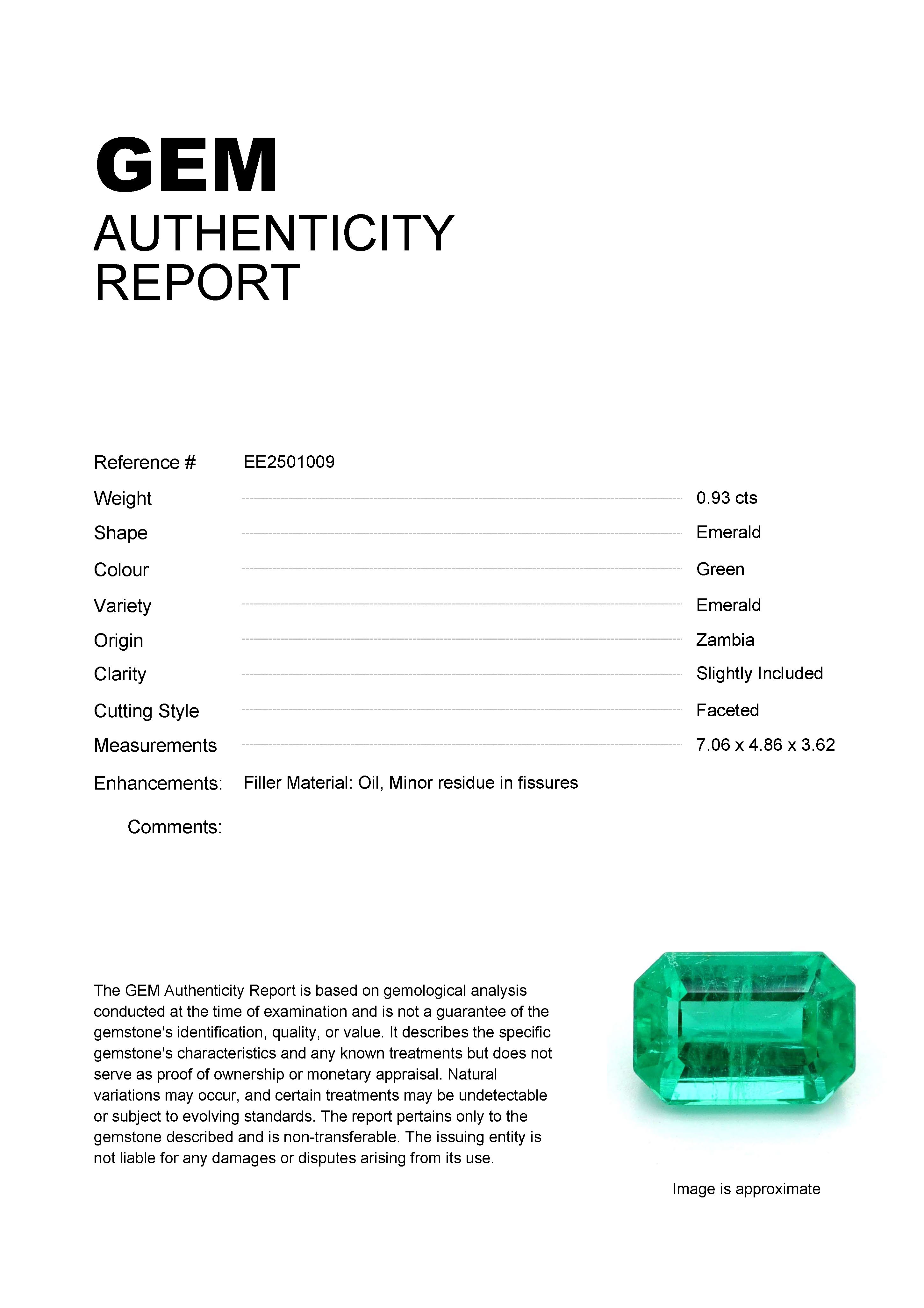 0.93ct Green Emerald Zambia EmeraldCarat: 0.93 ctType: EmeraldCut: EmeraldColour: GreenOrigin: ZambiaComment: Not Heated,