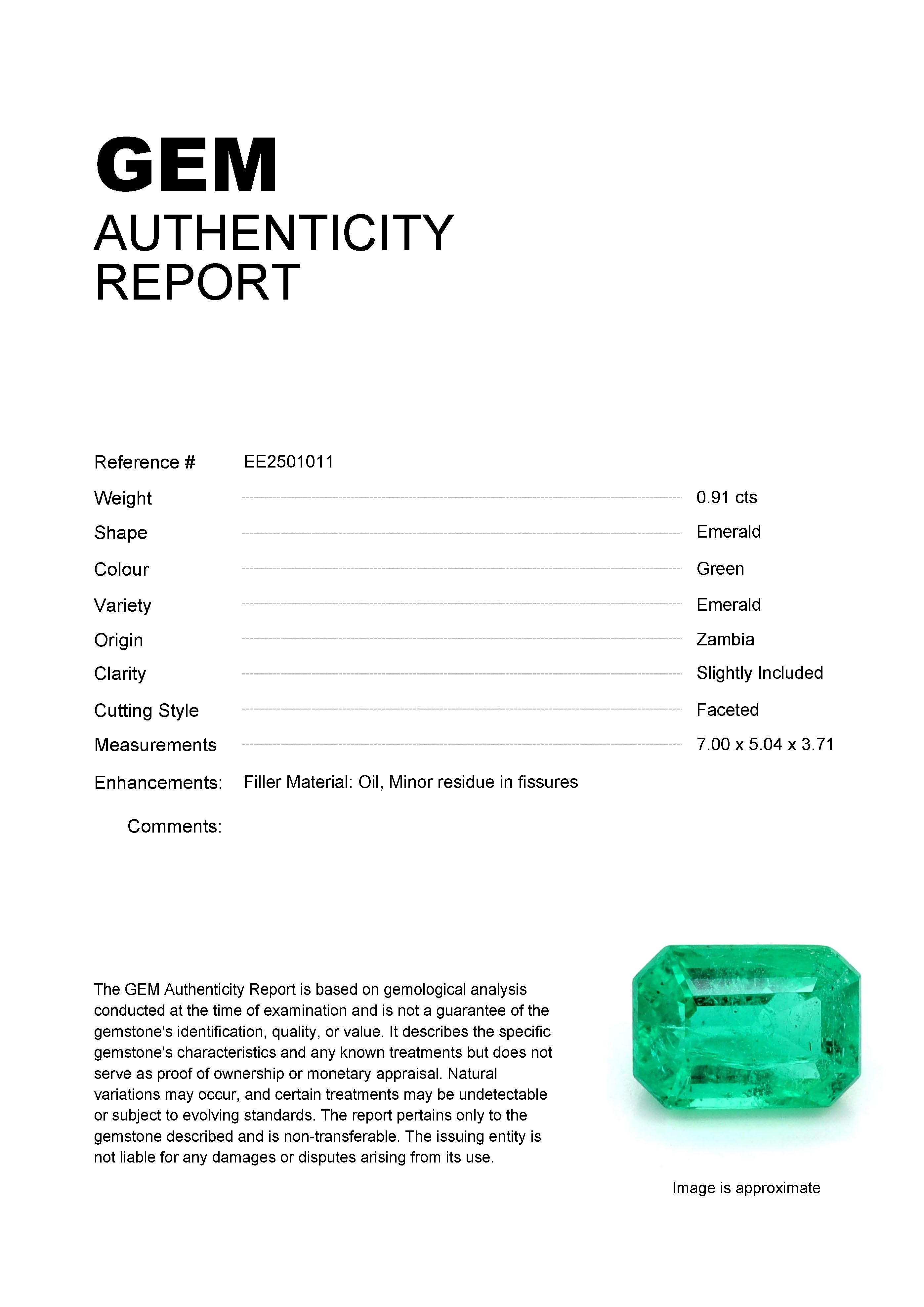 0.91ct Green Emerald Zambia EmeraldCarat: 0.91 ctType: EmeraldCut: EmeraldColour: GreenOrigin: ZambiaComment: Not Heated,