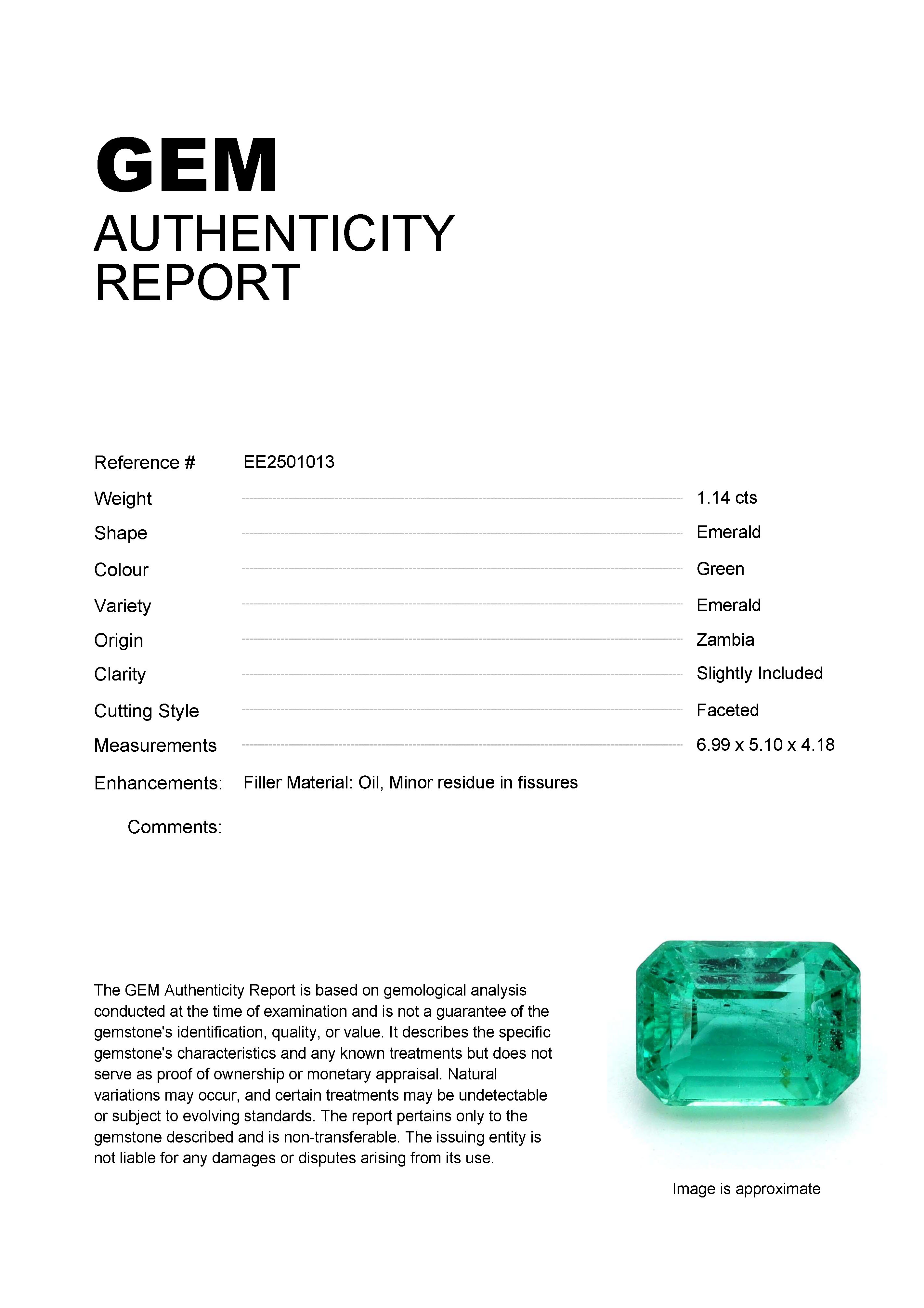 1.14ct Green Emerald Zambia EmeraldCarat: 1.14 ctType: EmeraldCut: EmeraldColour: GreenOrigin: ZambiaComment: Not Heated,