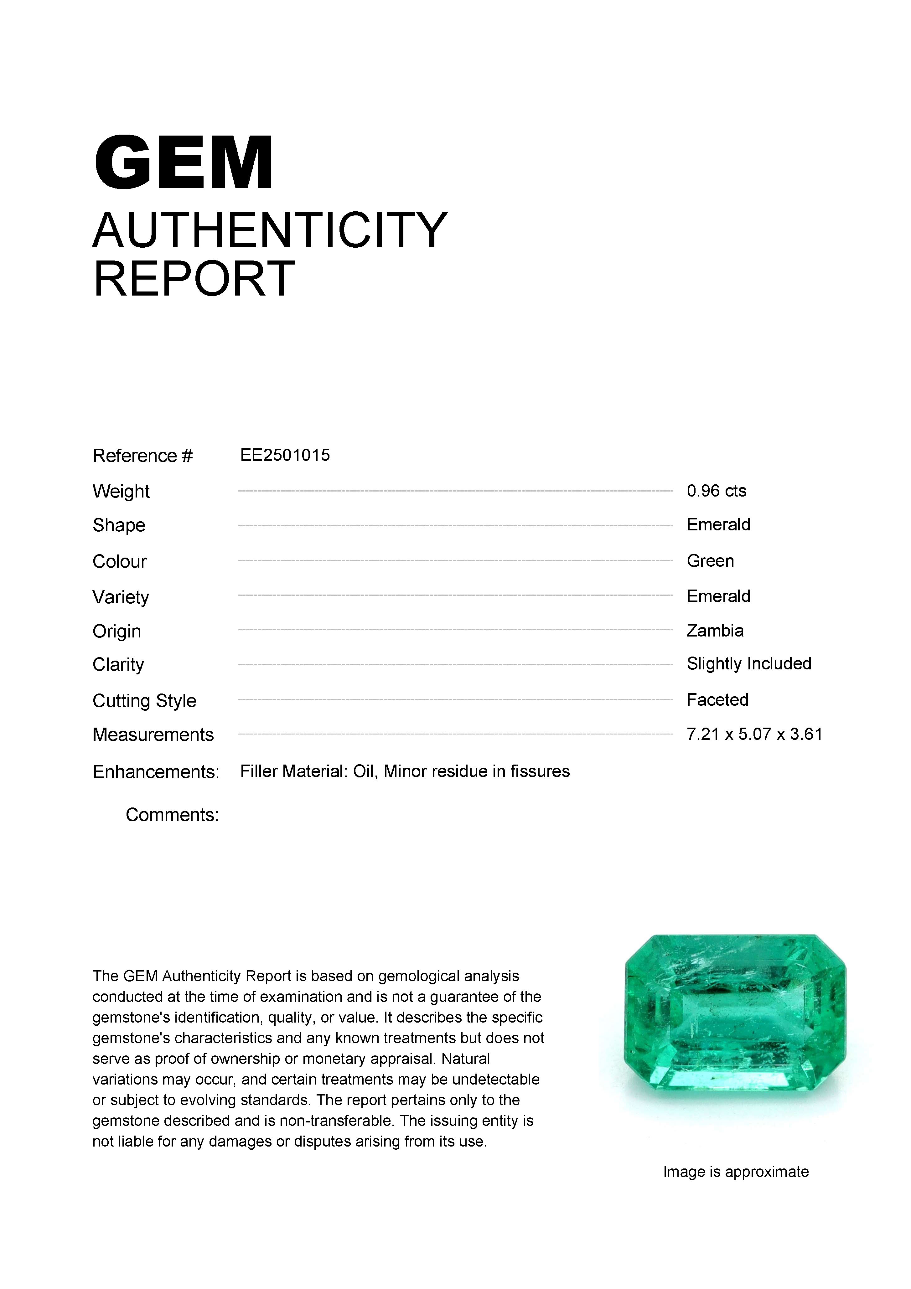 0.96ct Green Emerald Zambia EmeraldCarat: 0.96 ctType: EmeraldCut: EmeraldColour: GreenOrigin: ZambiaComment: Not Heated,