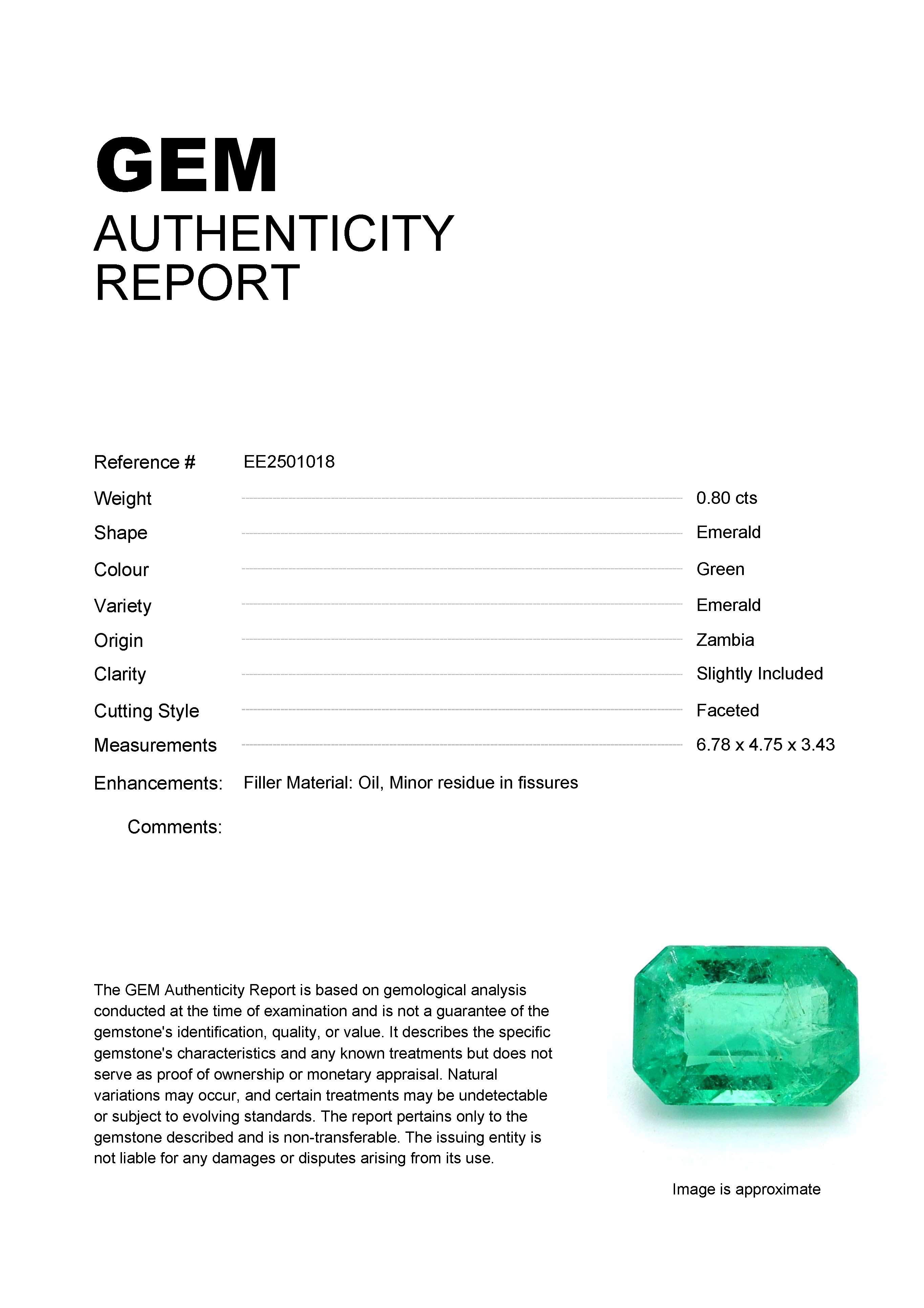 0.80ct Green Emerald Zambia EmeraldCarat: 0.80 ctType: EmeraldCut: EmeraldColour: GreenOrigin: ZambiaComment: Not Heated,