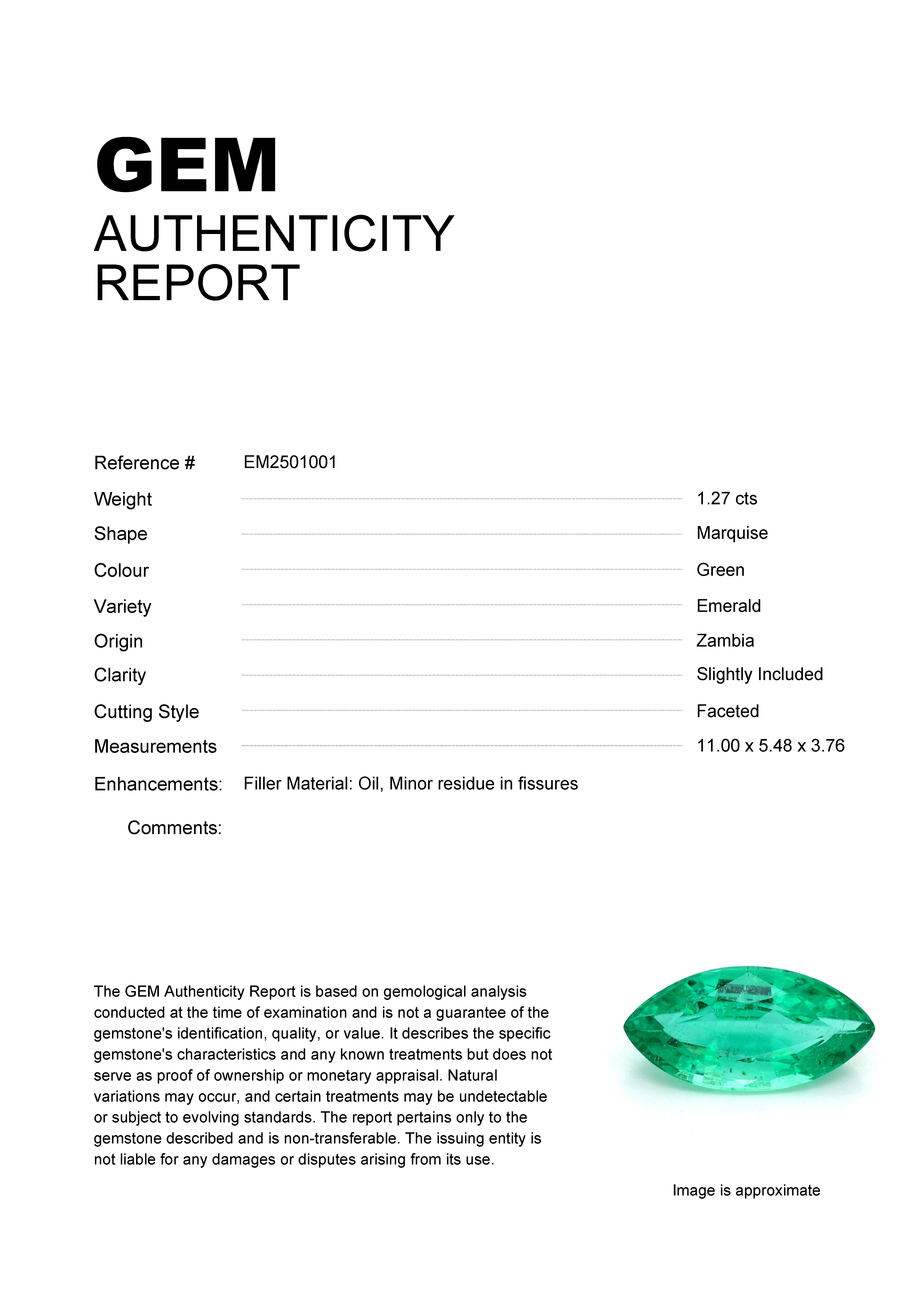 1.27ct Green Marquise Zambia EmeraldCarat: 1.27 ctType: EmeraldCut: MarquiseColour: GreenOrigin: ZambiaComment: Not Heated,