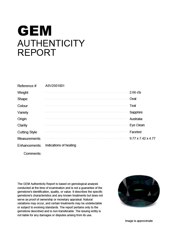 GEM: ASV2501001 Stock ID: ASV25010012.66ct Teal Oval Australia SapphireCarat: 2.66 ctType: SapphireCut: OvalColour: TealOrigin: AustraliaComment: Heated9.77 x 7.42 x 4.77 mm
