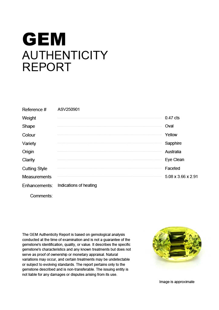 0.47ct Yellow Oval Australia SapphireCarat: 0.47 ctType: SapphireCut: OvalColour: YellowOrigin: AustraliaComment: Heated5.08 x 3.66 x 2.91 mm