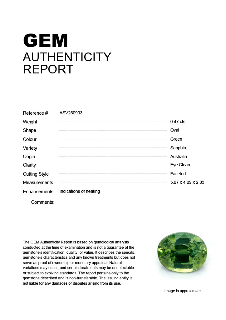 0.47ct Green Oval Australia SapphireCarat: 0.47 ctType: SapphireCut: OvalColour: GreenOrigin: AustraliaComment: Heated5.07 x 4.09 x 2.83 mm