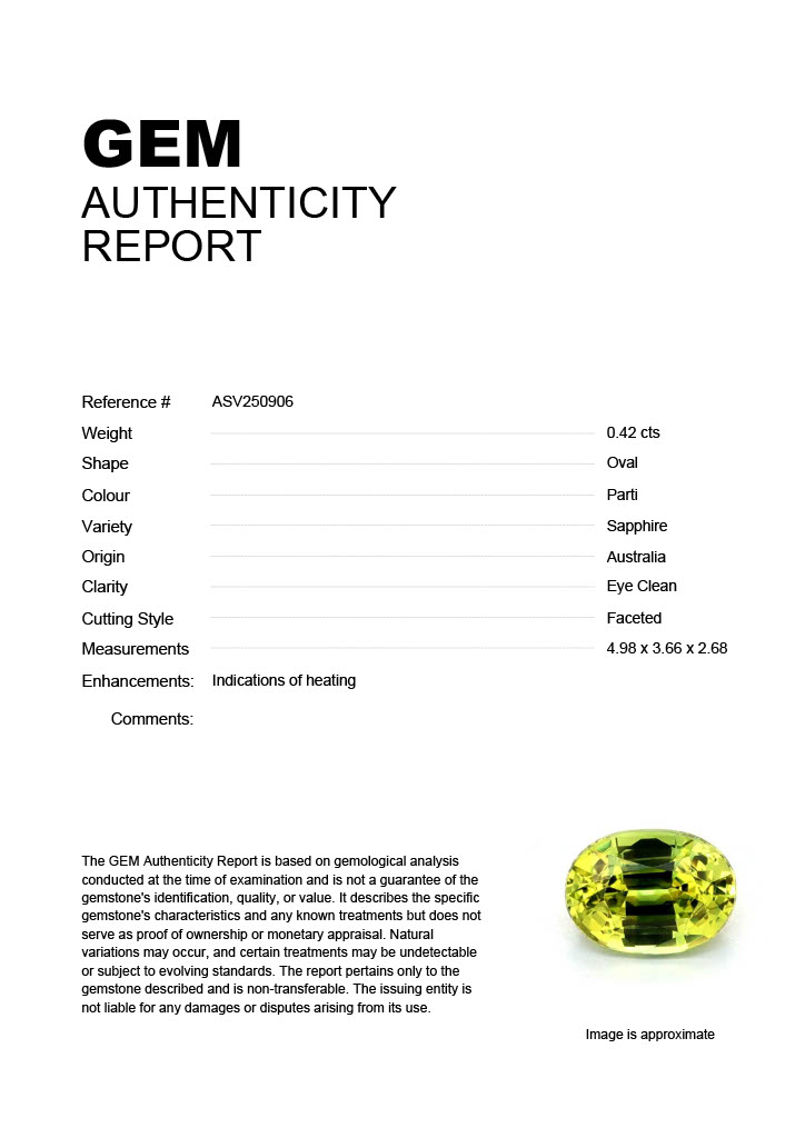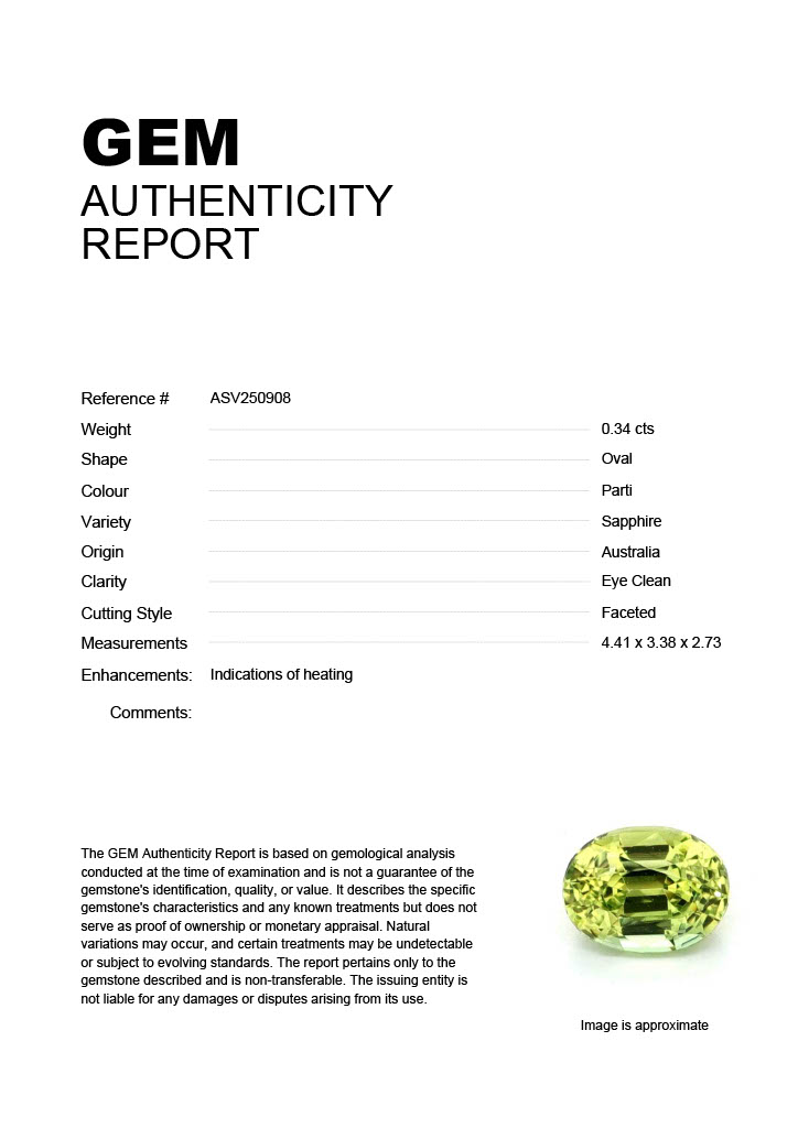 0.34ct Parti Oval Australia SapphireCarat: 0.34 ctType: SapphireCut: OvalColour: PartiOrigin: AustraliaComment: Heated4.41 x 3.38 x 2.73 mm