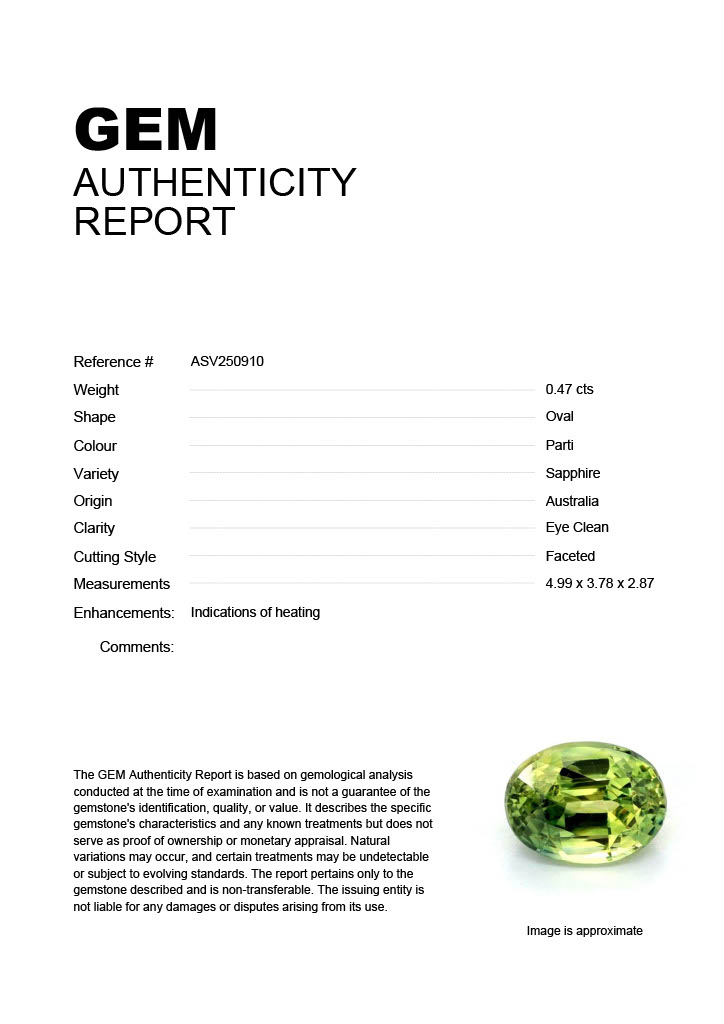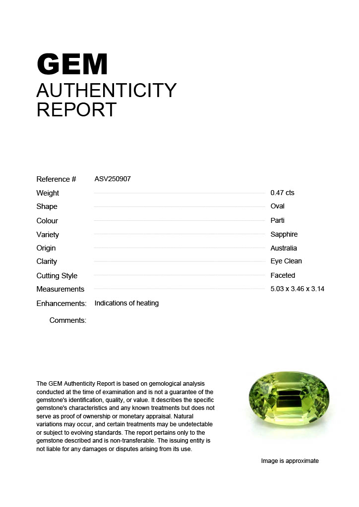 0.47ct Parti Oval Australia SapphireCarat: 0.47 ctType: SapphireCut: OvalColour: PartiOrigin: AustraliaComment: Heated4.99 x 3.78 x 2.87 mm
