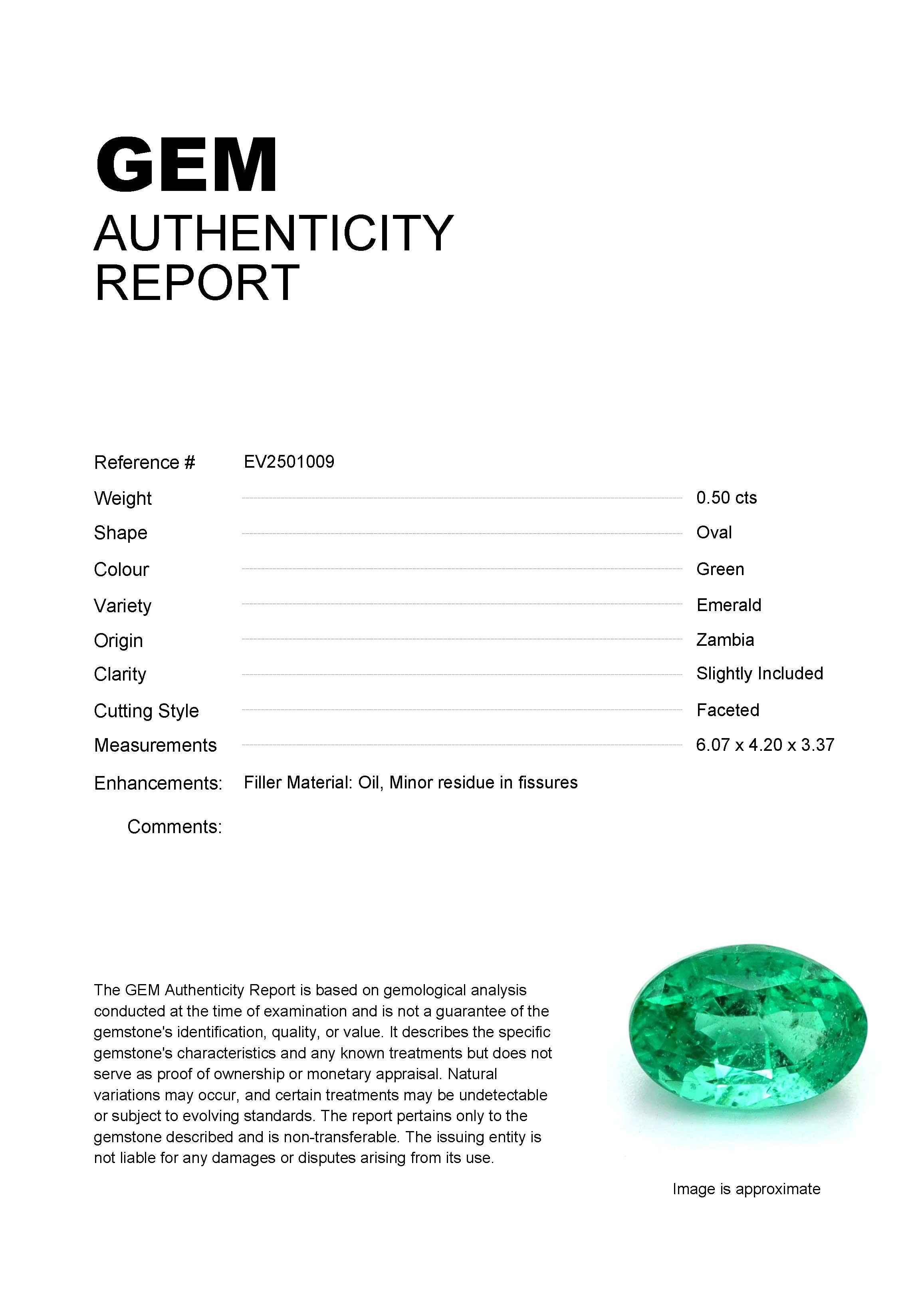 0.50ct Green Oval Zambia EmeraldCarat: 0.50 ctType: EmeraldCut: OvalColour: GreenOrigin: ZambiaComment: Not Heated,