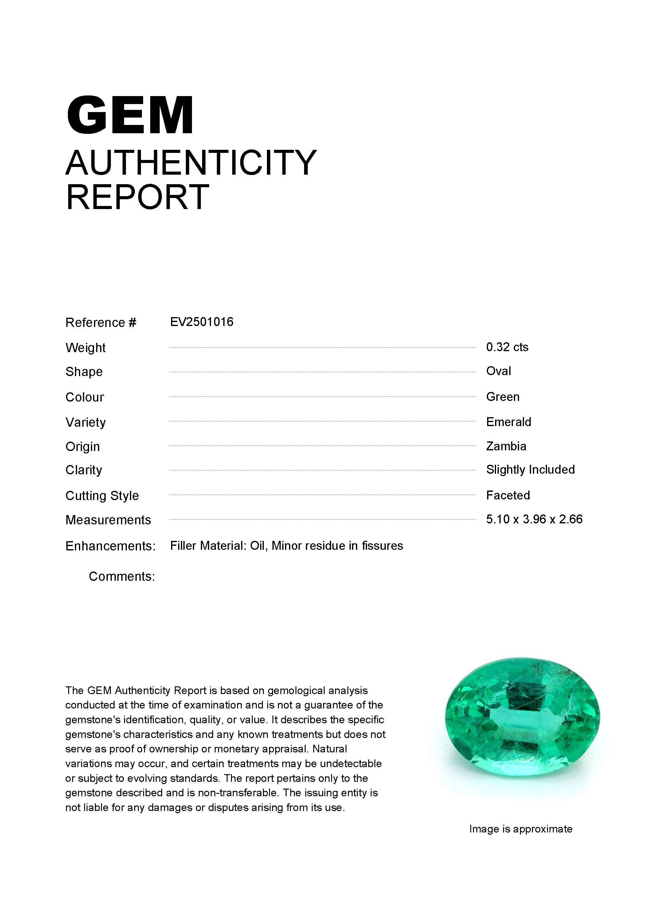 0.32ct Green Oval Zambia EmeraldCarat: 0.32 ctType: EmeraldCut: OvalColour: GreenOrigin: ZambiaComment: Not Heated,