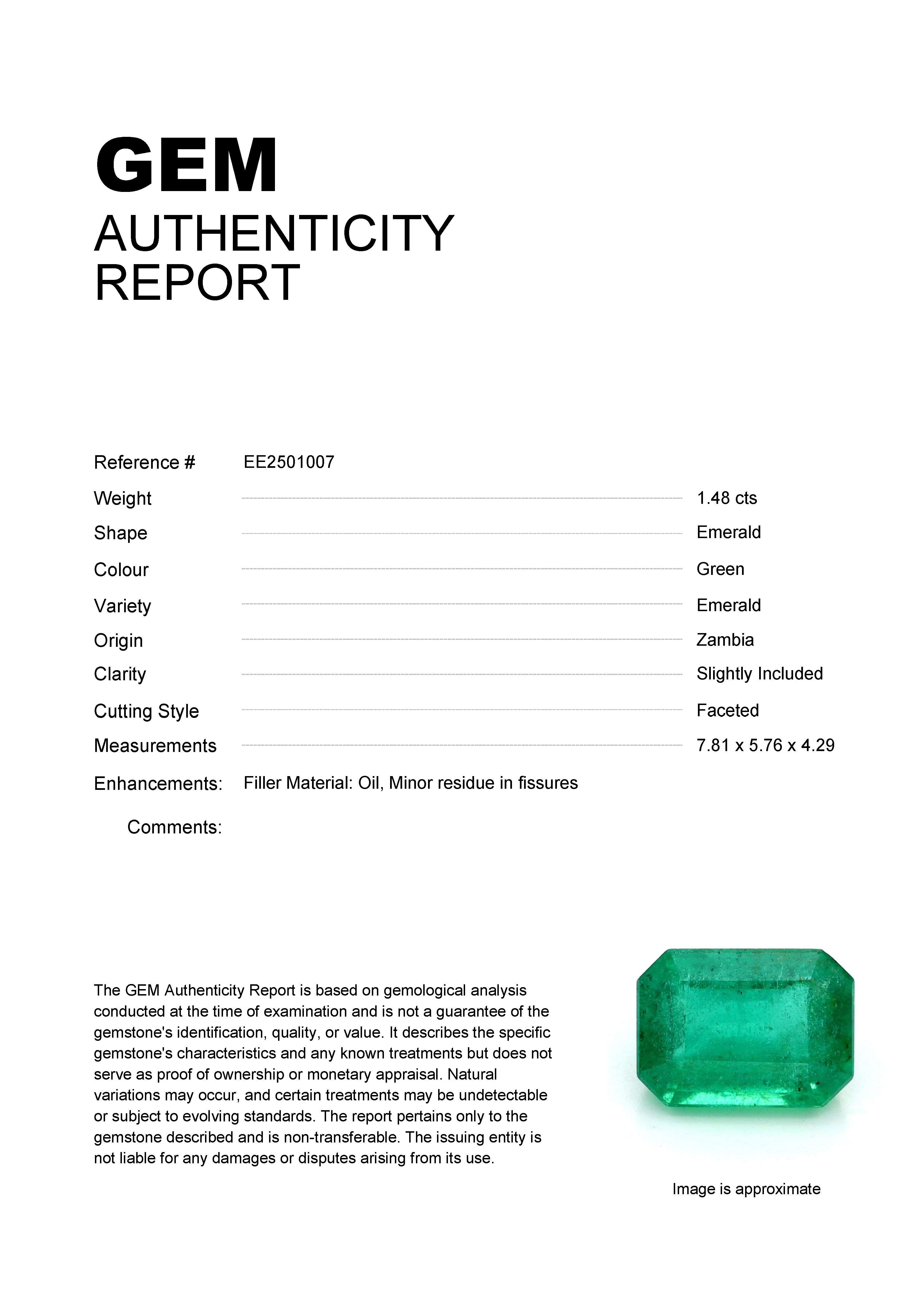1.48ct Green Emerald Zambia EmeraldCarat: 1.48 ctType: EmeraldCut: EmeraldColour: GreenOrigin: ZambiaComment: Not Heated,