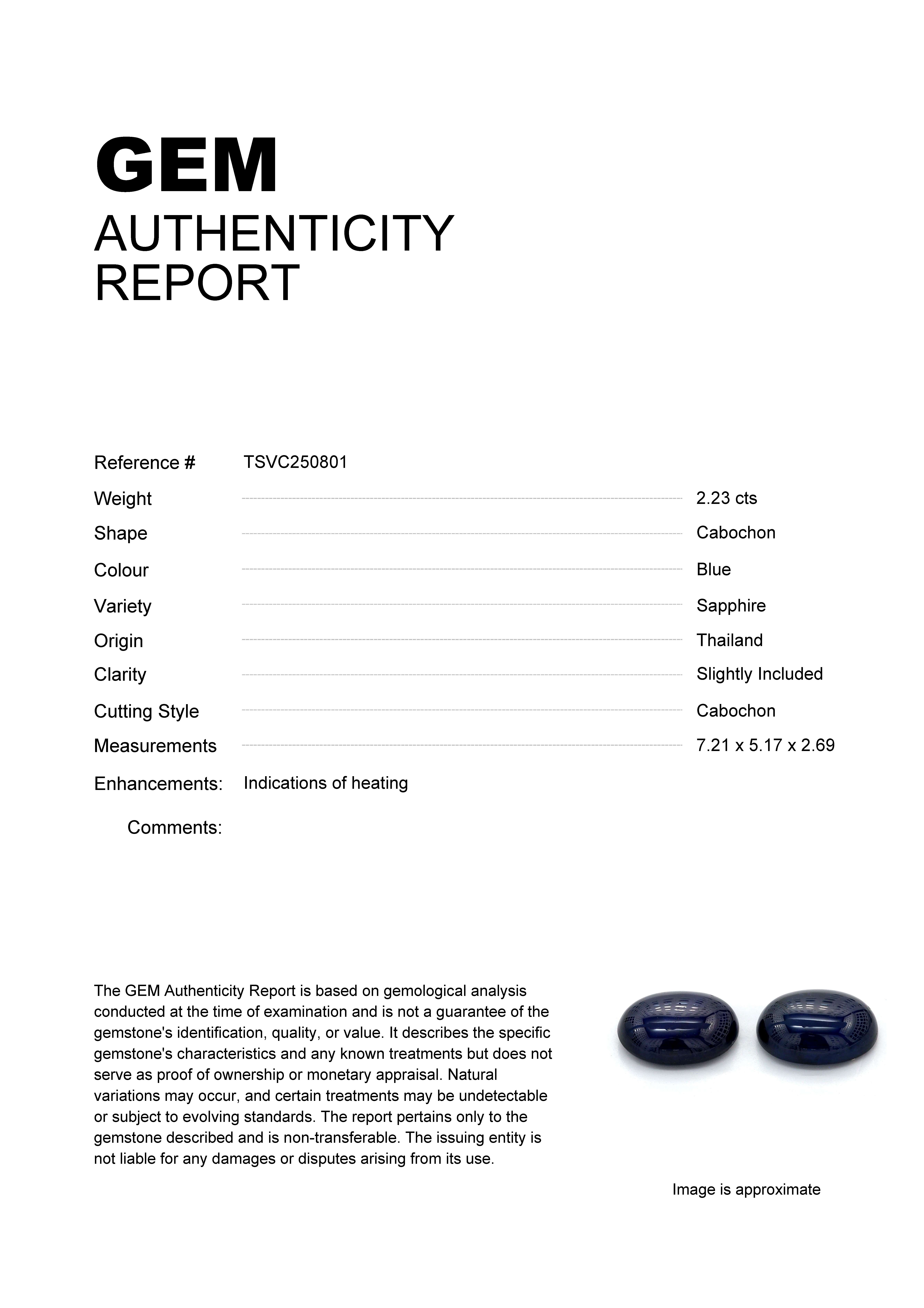 GEM: TSVC250801 Stock ID: TSVC2508012.23ct Blue Cabochon Thailand SapphireCarat: 2.23 ctType: SapphireCut: CabochonColour: BlueOrigin: ThailandComment: Heated7.21 x 5.17 x 2.69 mm