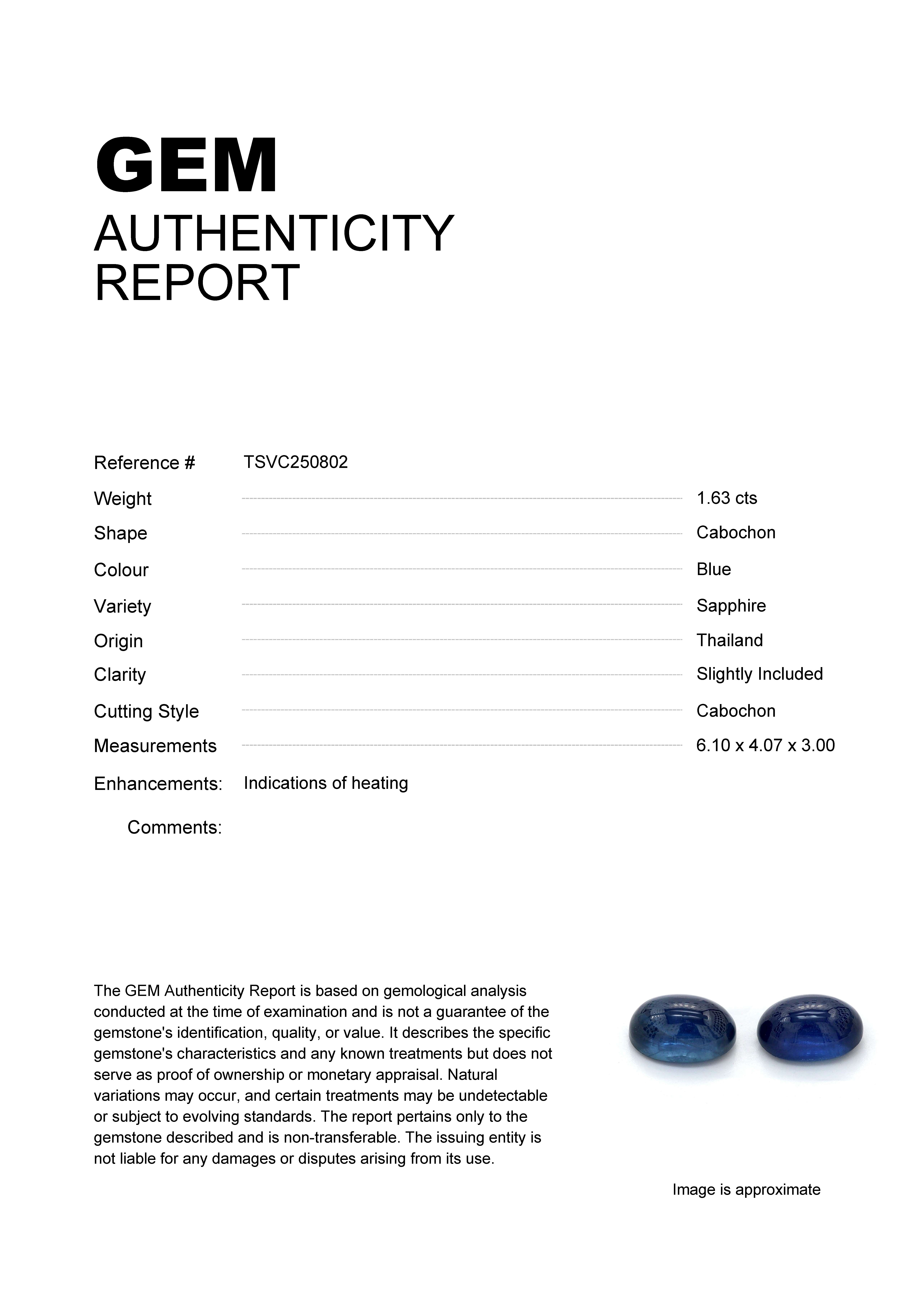 GEM: TSVC250805 Stock ID: TSVC2508051.71ct Blue Cabochon Thailand SapphireCarat: 1.71 ctType: SapphireCut: CabochonColour: BlueOrigin: ThailandComment: Heated6.16 x 4.15 x 3.07 mm