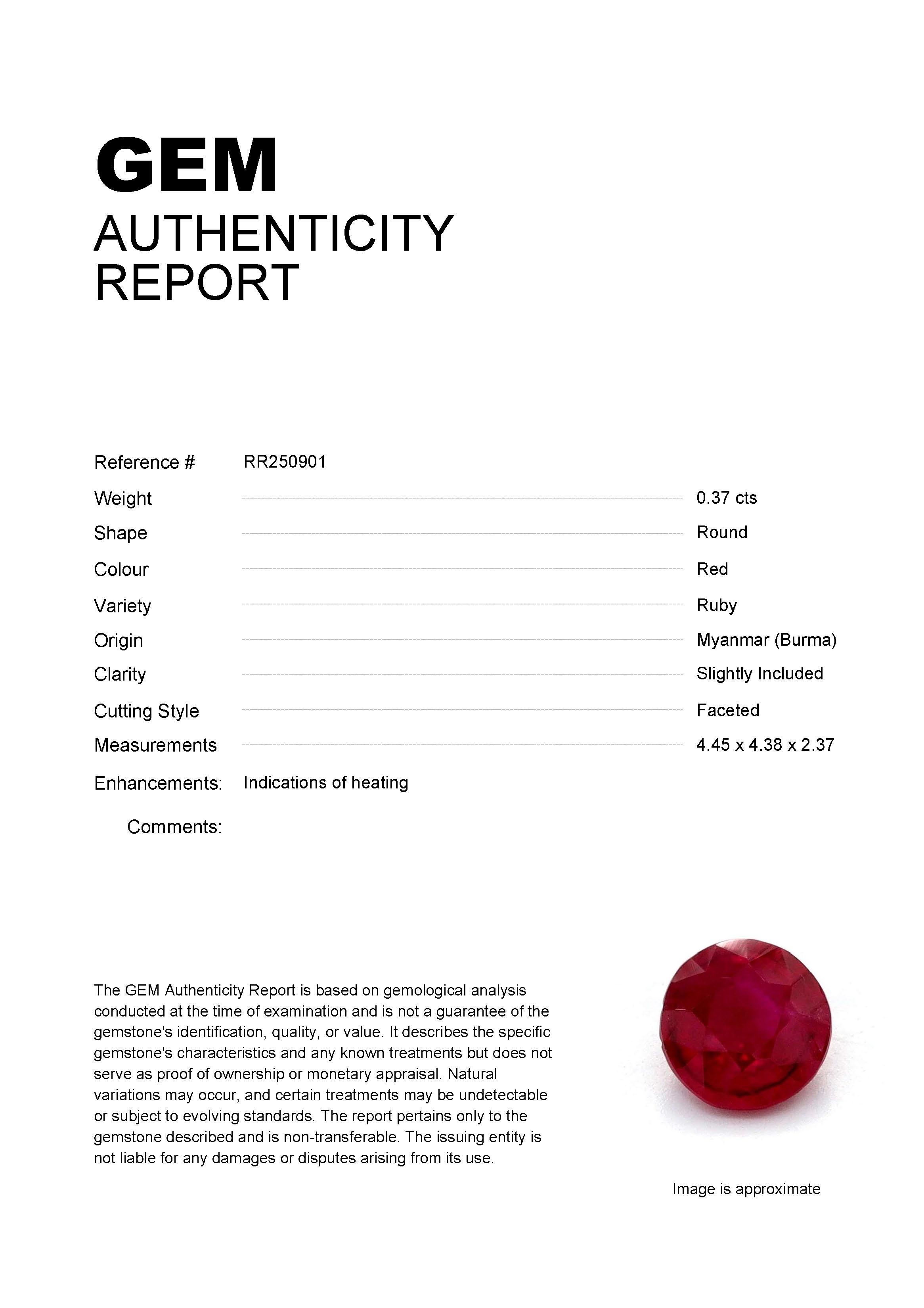 0.37ct Red Round Myanmar (Burma) RubyCarat: 0.37 ctType: RubyCut: RoundColour: RedOrigin: Myanmar (Burma)Comment: Heated4.45 x 4.38 x 2.37 mm