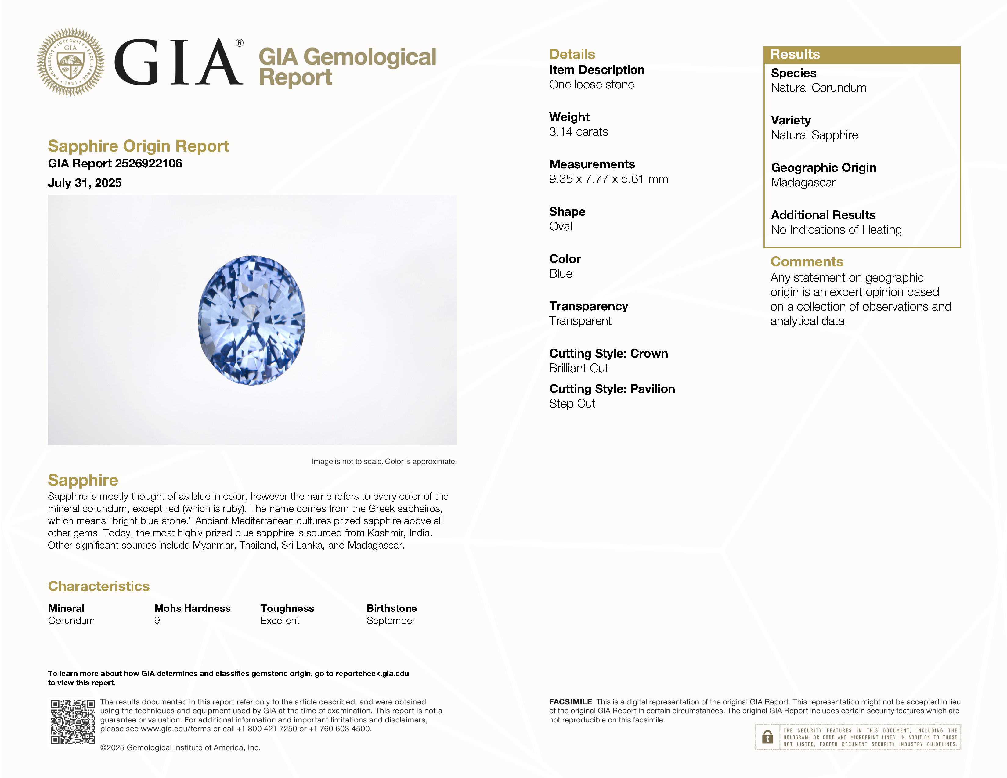 GIA: 2526922106 Stock ID: MSV24110413.14ct Blue Oval Madagascar SapphireCarat: 3.14 ctType: SapphireCut: OvalColour: BlueOrigin: MadagascarComment: Not Heated9.35 x 7.77 x 5.61 mm