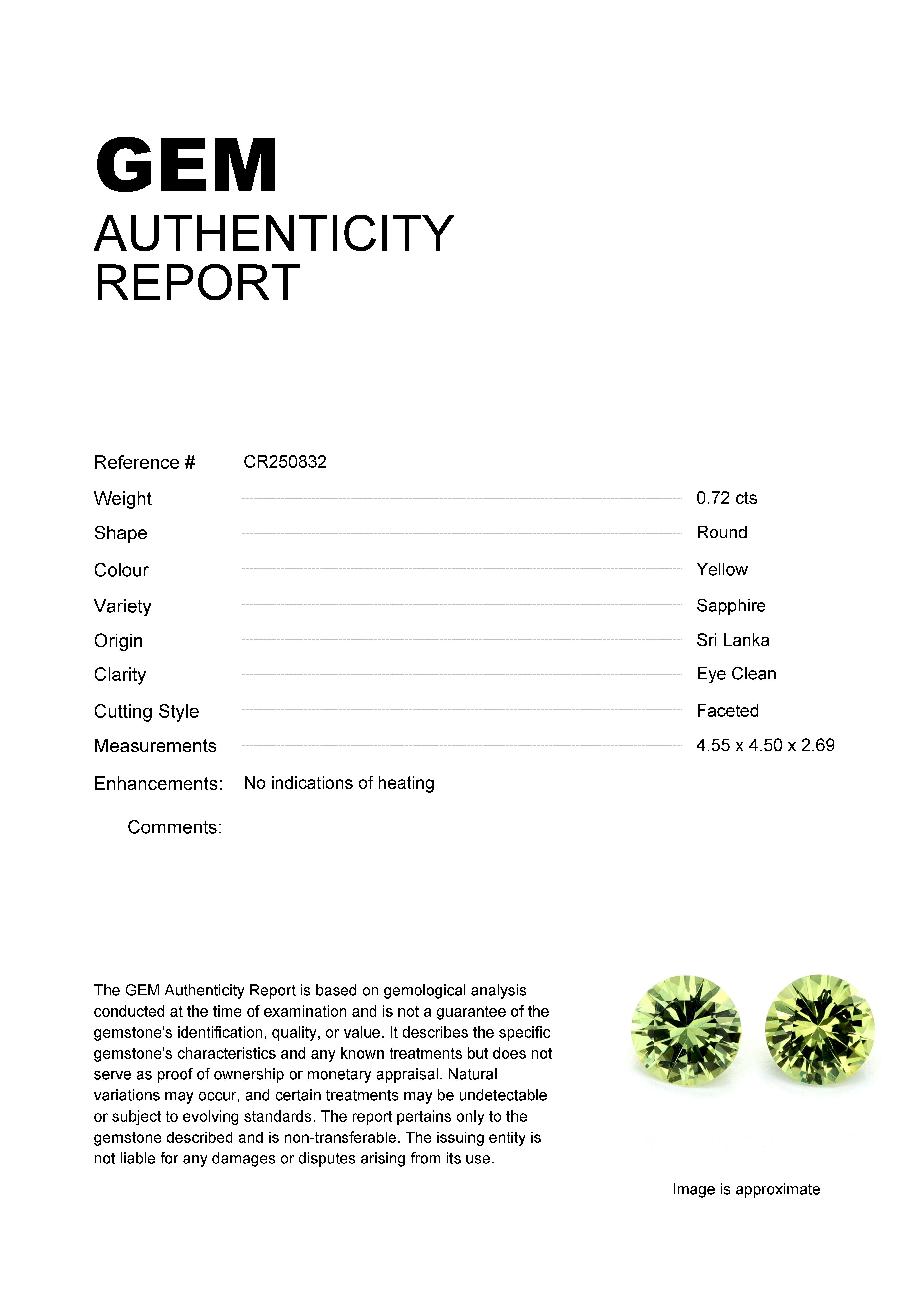 0.72ct Yellow Round Sri Lanka SapphireCarat: 0.72 ctType: SapphireCut: RoundColour: YellowOrigin: Sri LankaComment: Not Heated4.55 x 4.50 x 2.69 mm