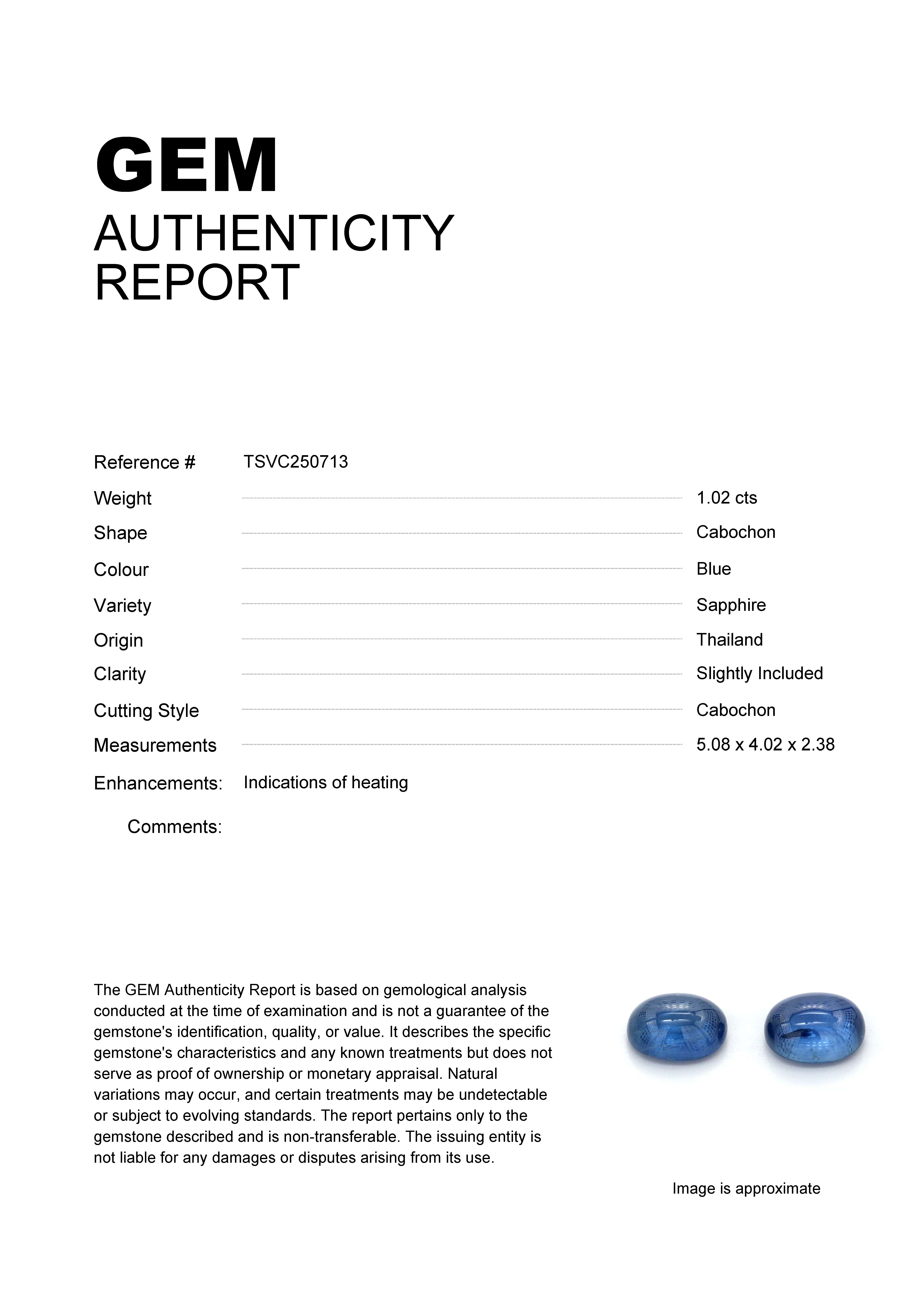 GEM: TSVC250713 Stock ID: TSVC2507131.02ct Blue Cabochon Thailand SapphireCarat: 1.02 ctType: SapphireCut: CabochonColour: BlueOrigin: ThailandComment: Heated5.08 x 4.02 x 2.38 mm