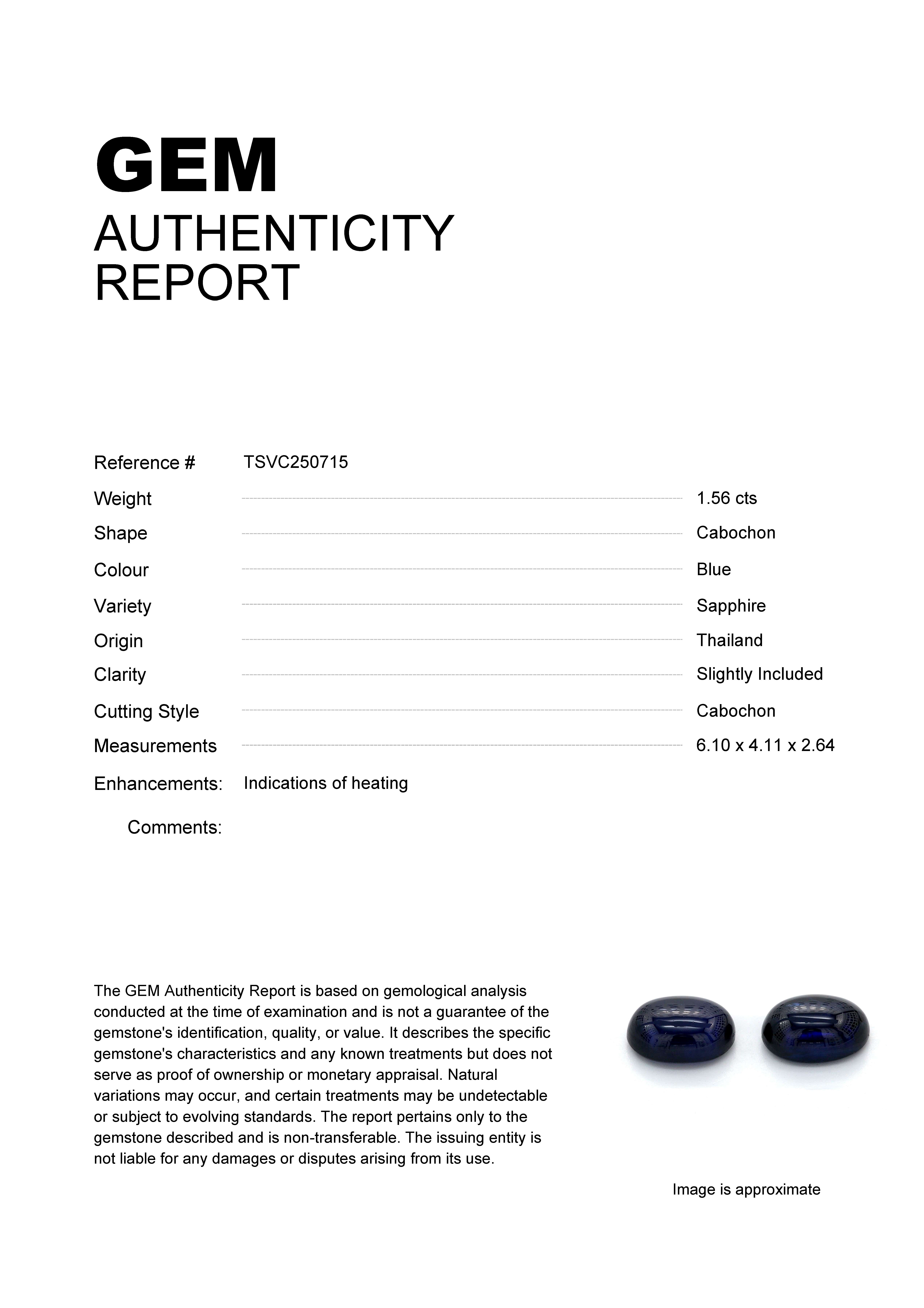 GEM: TSVC250715 Stock ID: TSVC2507151.56ct Blue Cabochon Thailand SapphireCarat: 1.56 ctType: SapphireCut: CabochonColour: BlueOrigin: ThailandComment: Heated6.10 x 4.11 x 2.64 mm
