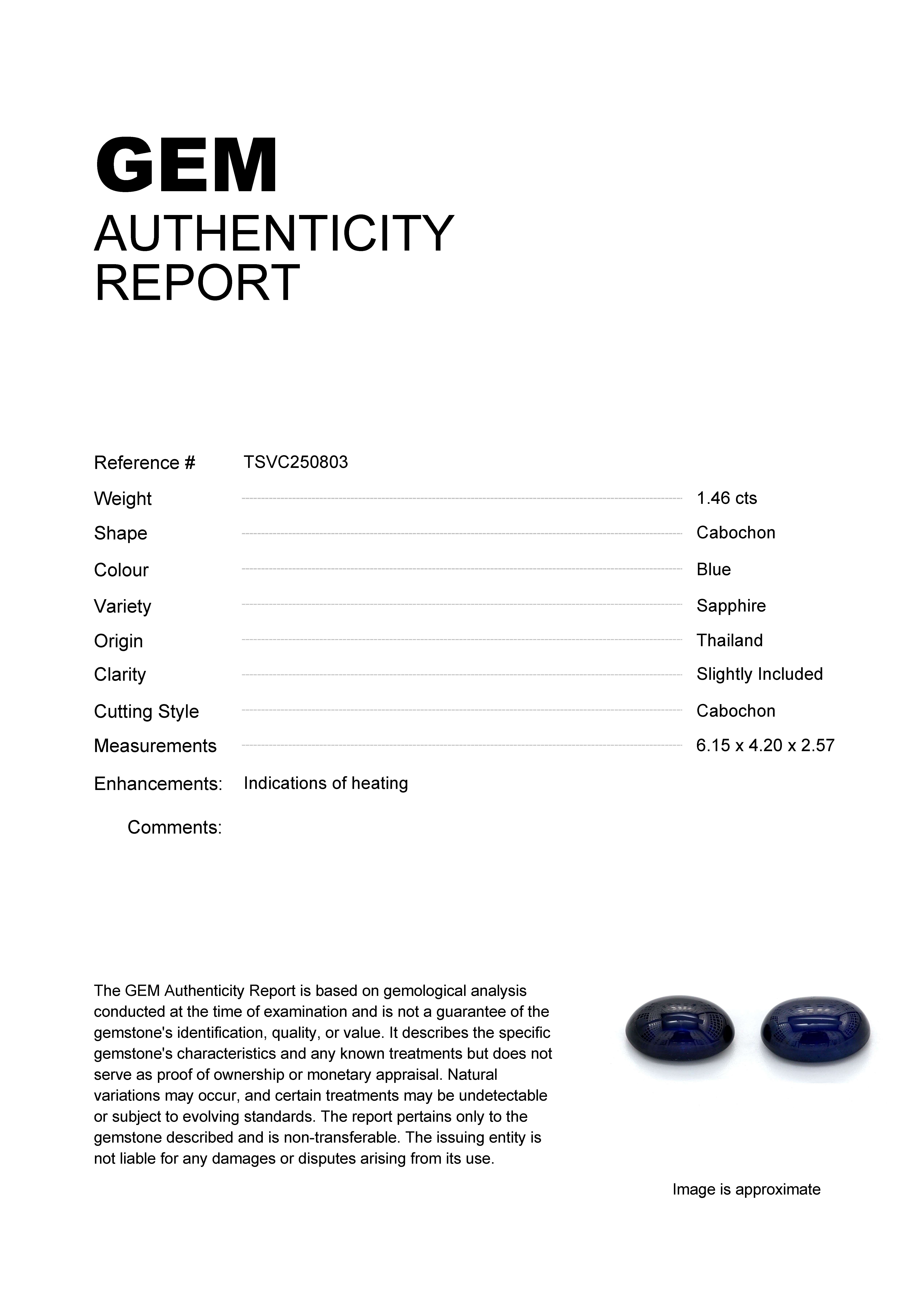 GEM: TSVC250803 Stock ID: TSVC2508031.46ct Blue Cabochon Thailand SapphireCarat: 1.46 ctType: SapphireCut: CabochonColour: BlueOrigin: ThailandComment: Heated6.15 x 4.20 x 2.57 mm