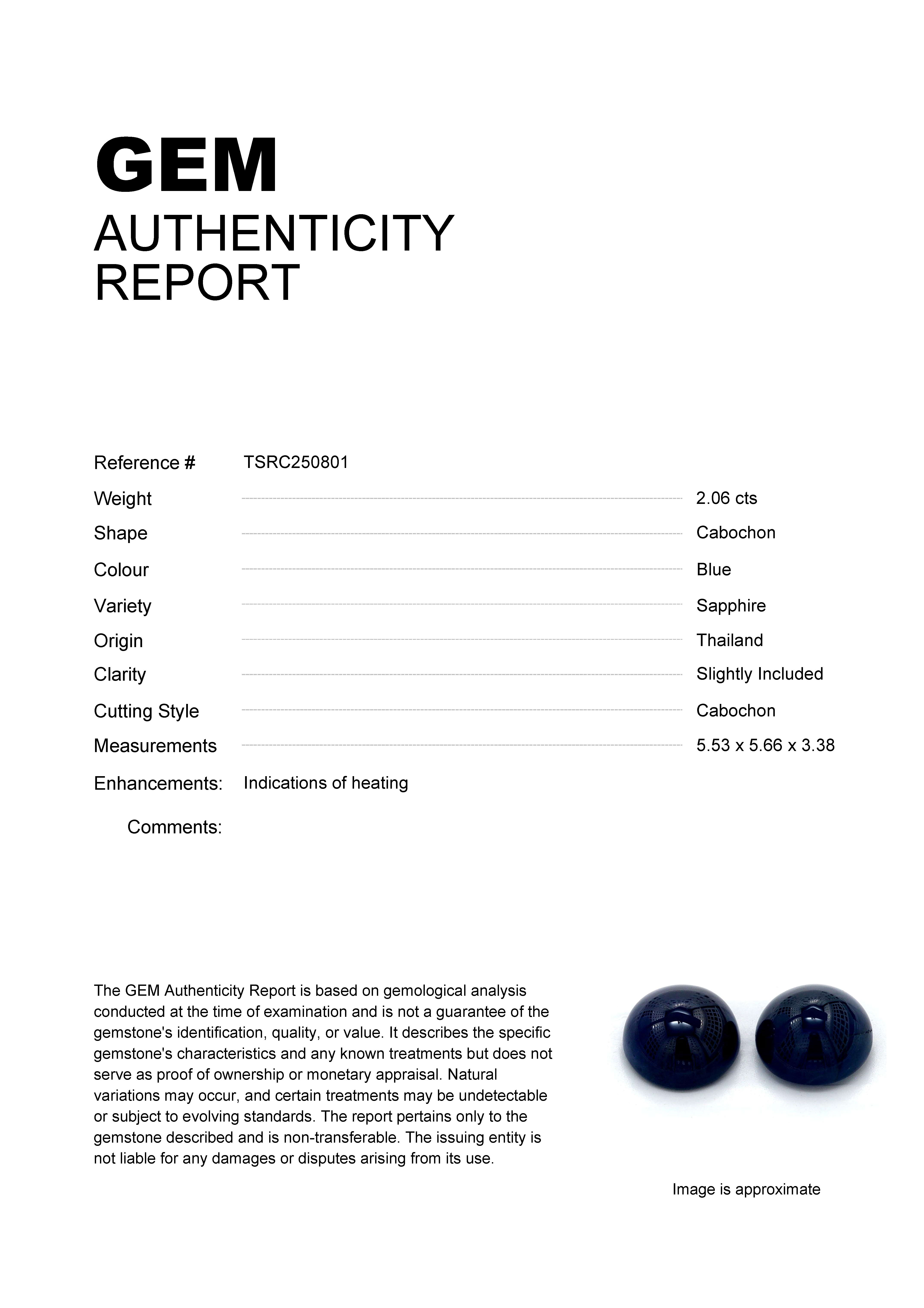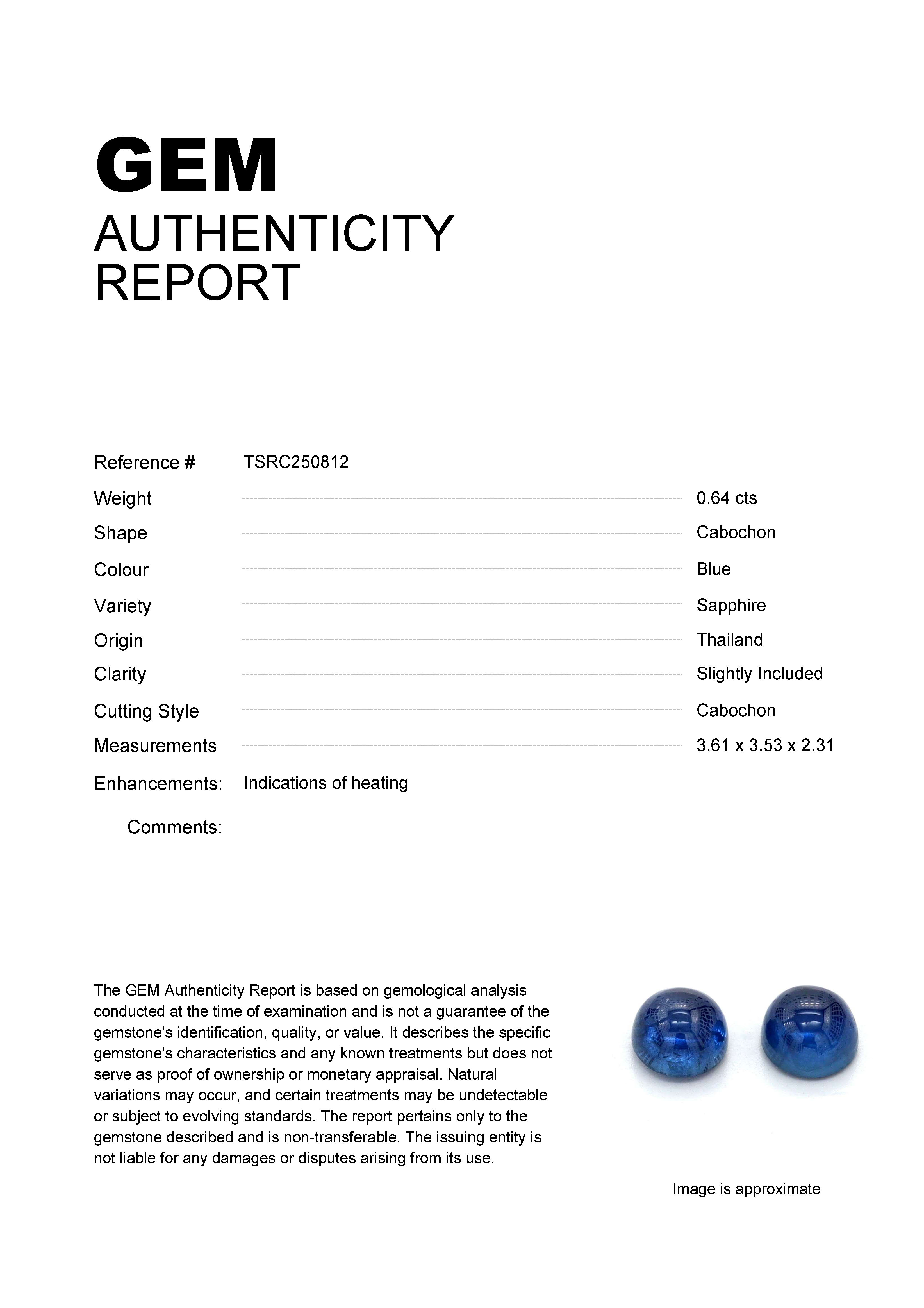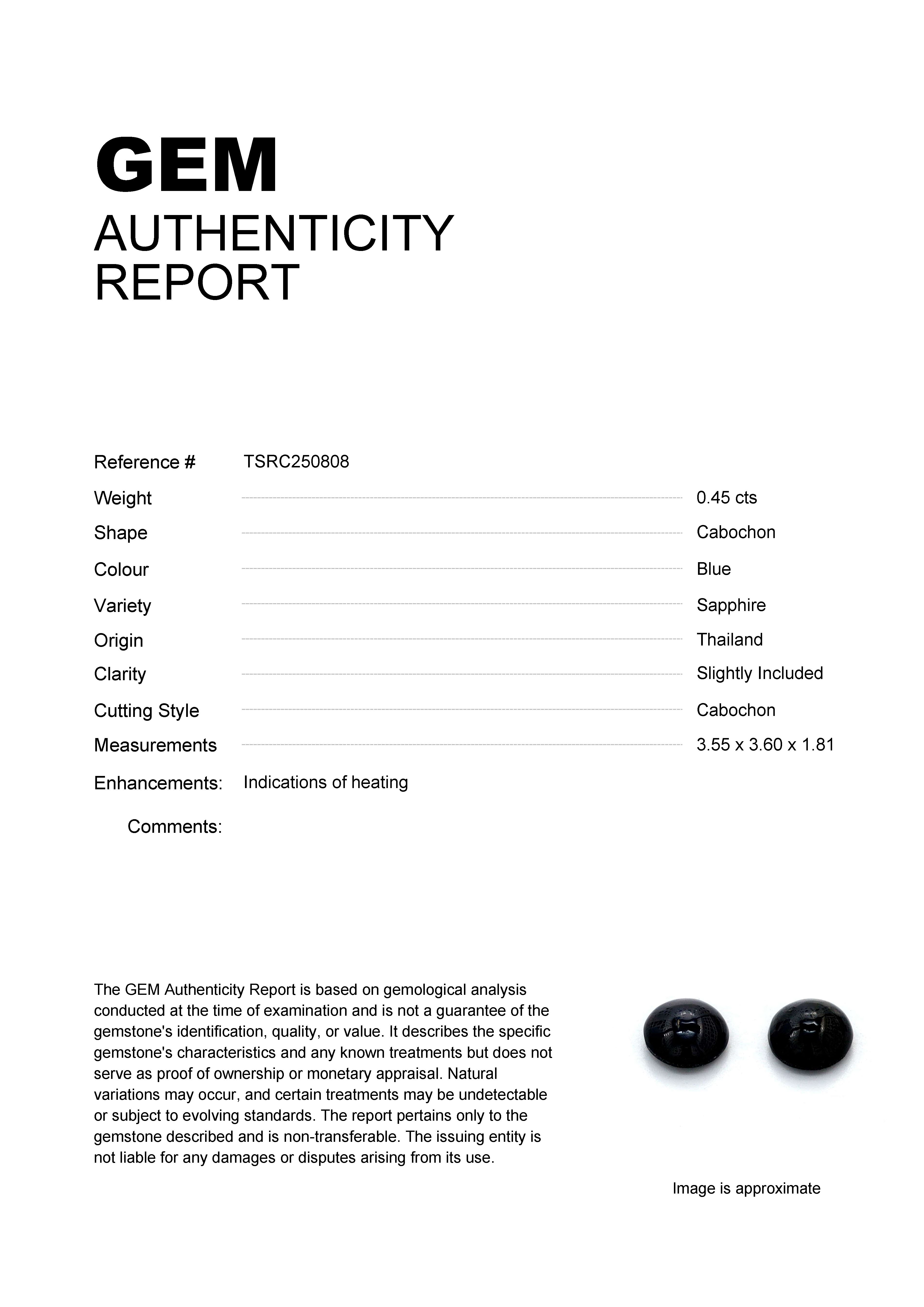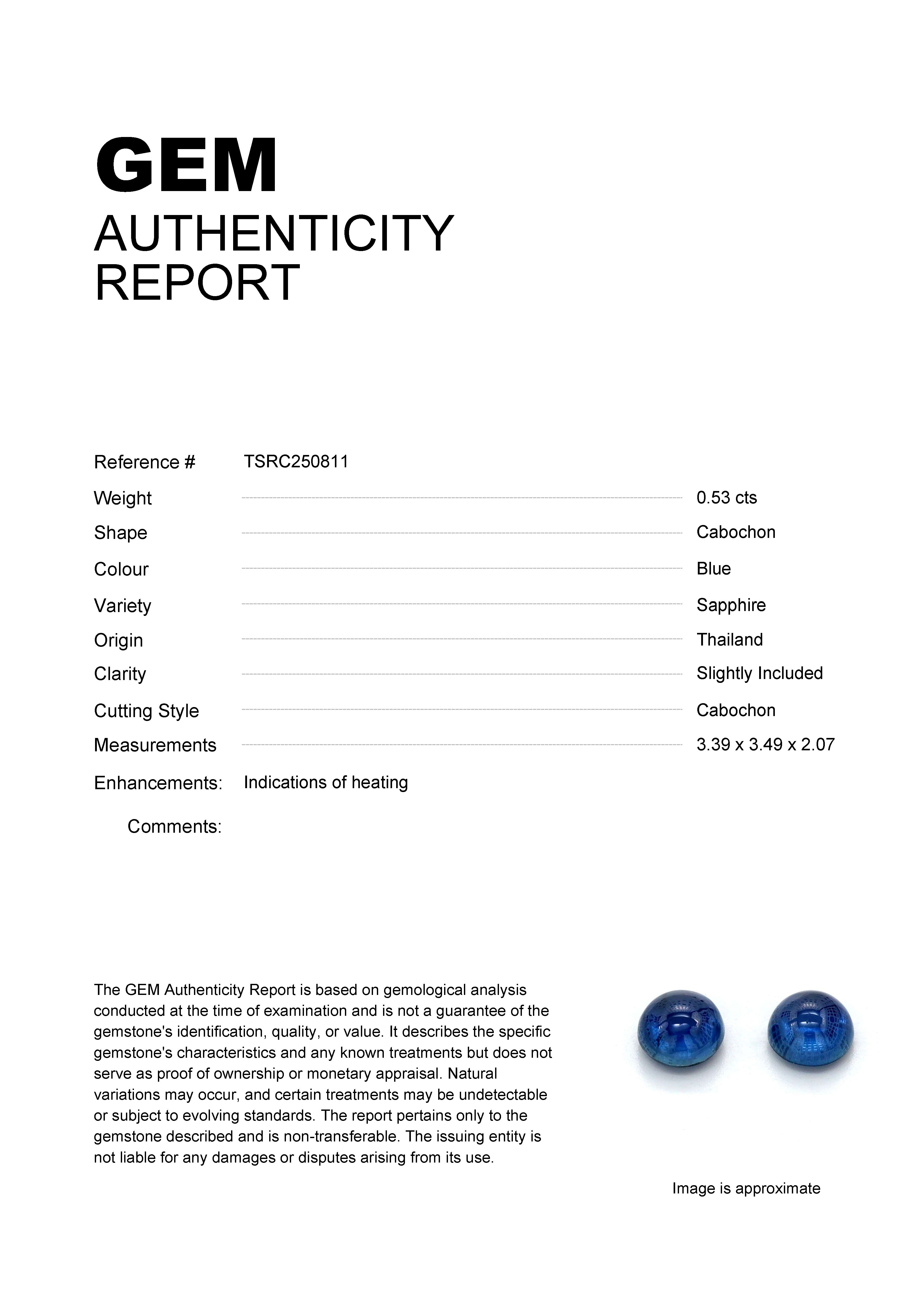 No certificate Matching set Stock ID: TSRC2508042.34ct Blue Cabochon Thailand SapphireCarat: 2.34 ctType: SapphireCut: CabochonColour: BlueOrigin: ThailandComment: Not Heated3.51 x 3.65 x 2.00 mm