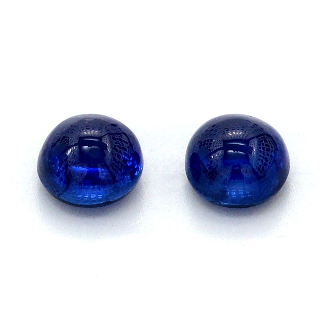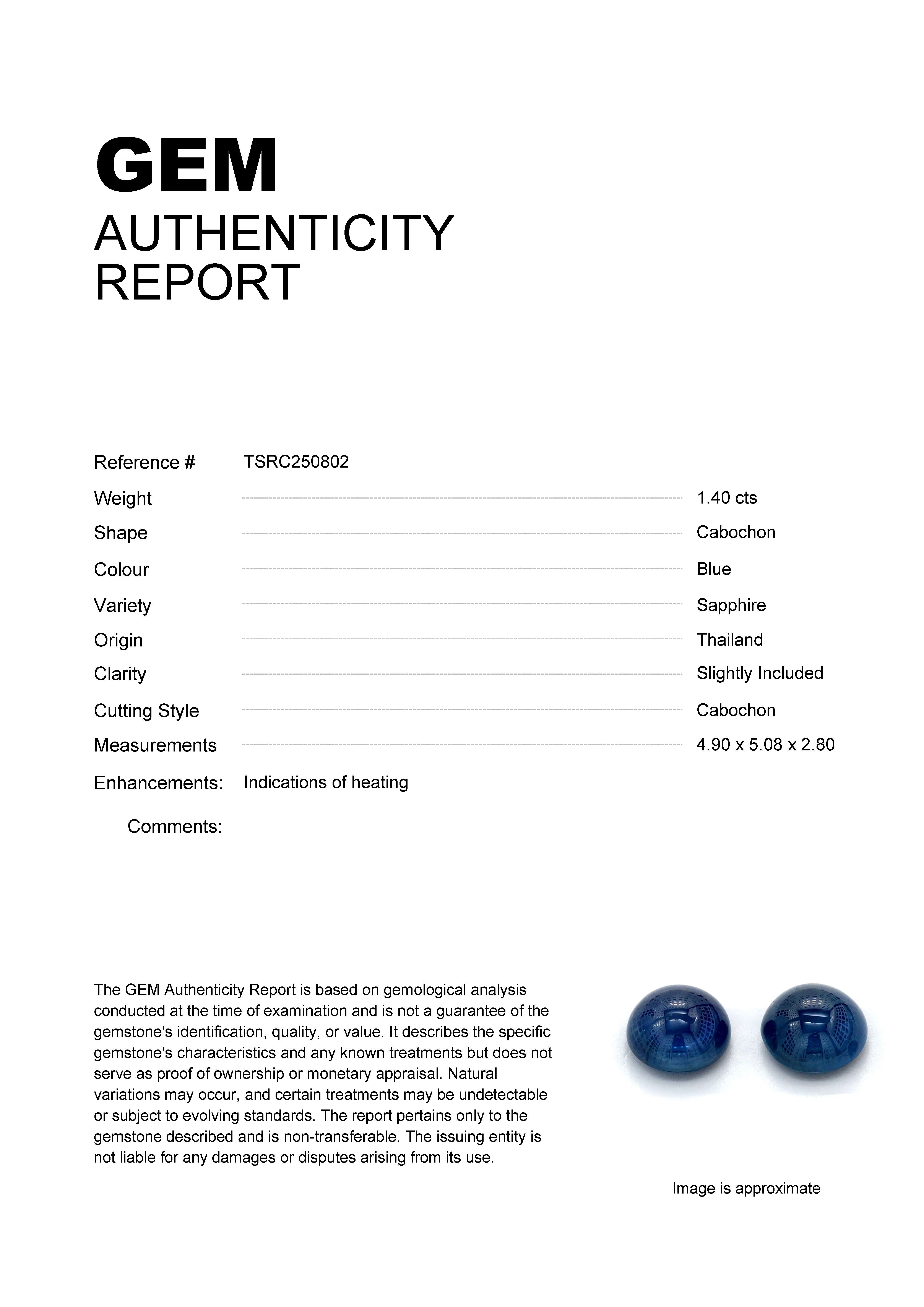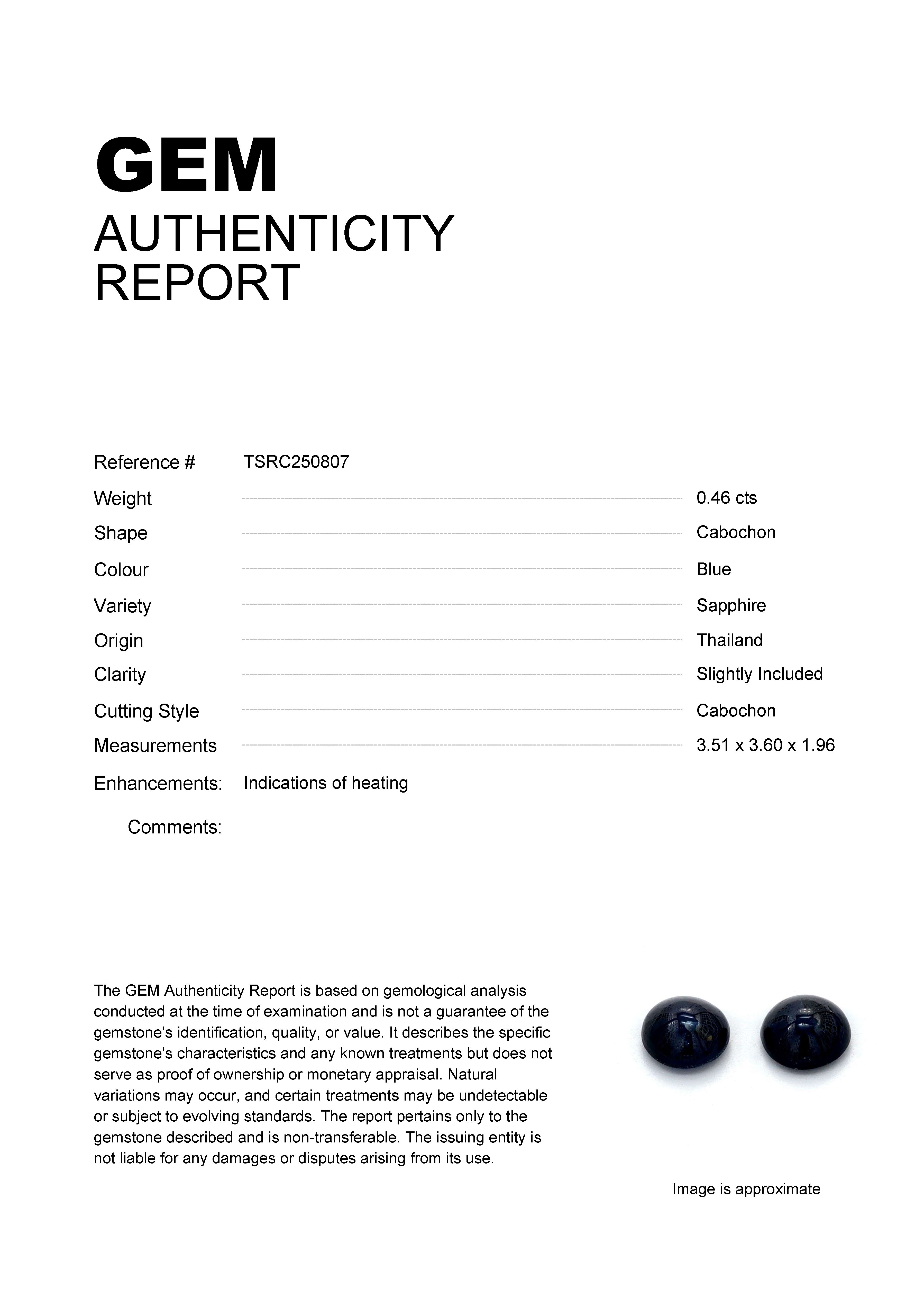 No certificate Matching set Stock ID: TSRC2508042.34ct Blue Cabochon Thailand SapphireCarat: 2.34 ctType: SapphireCut: CabochonColour: BlueOrigin: ThailandComment: Not Heated3.51 x 3.65 x 2.00 mm