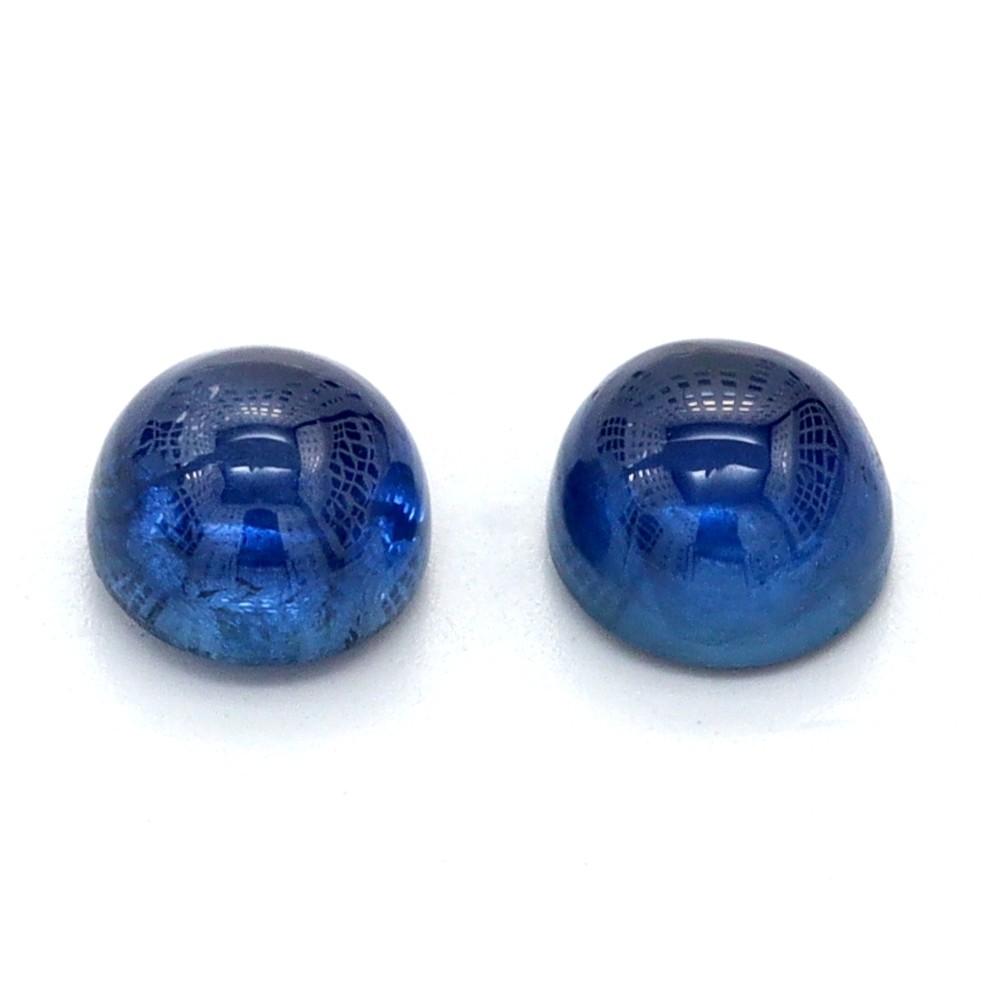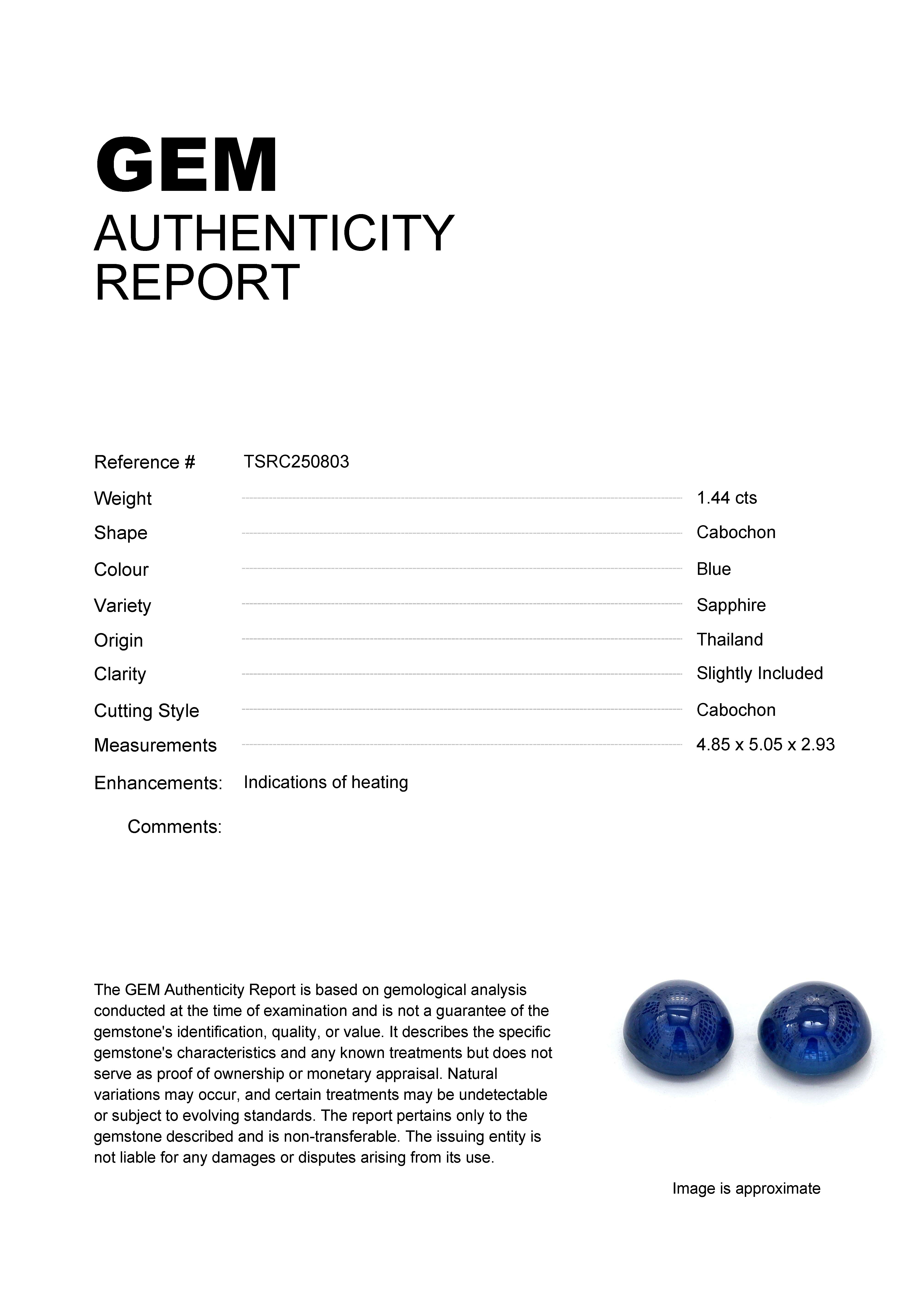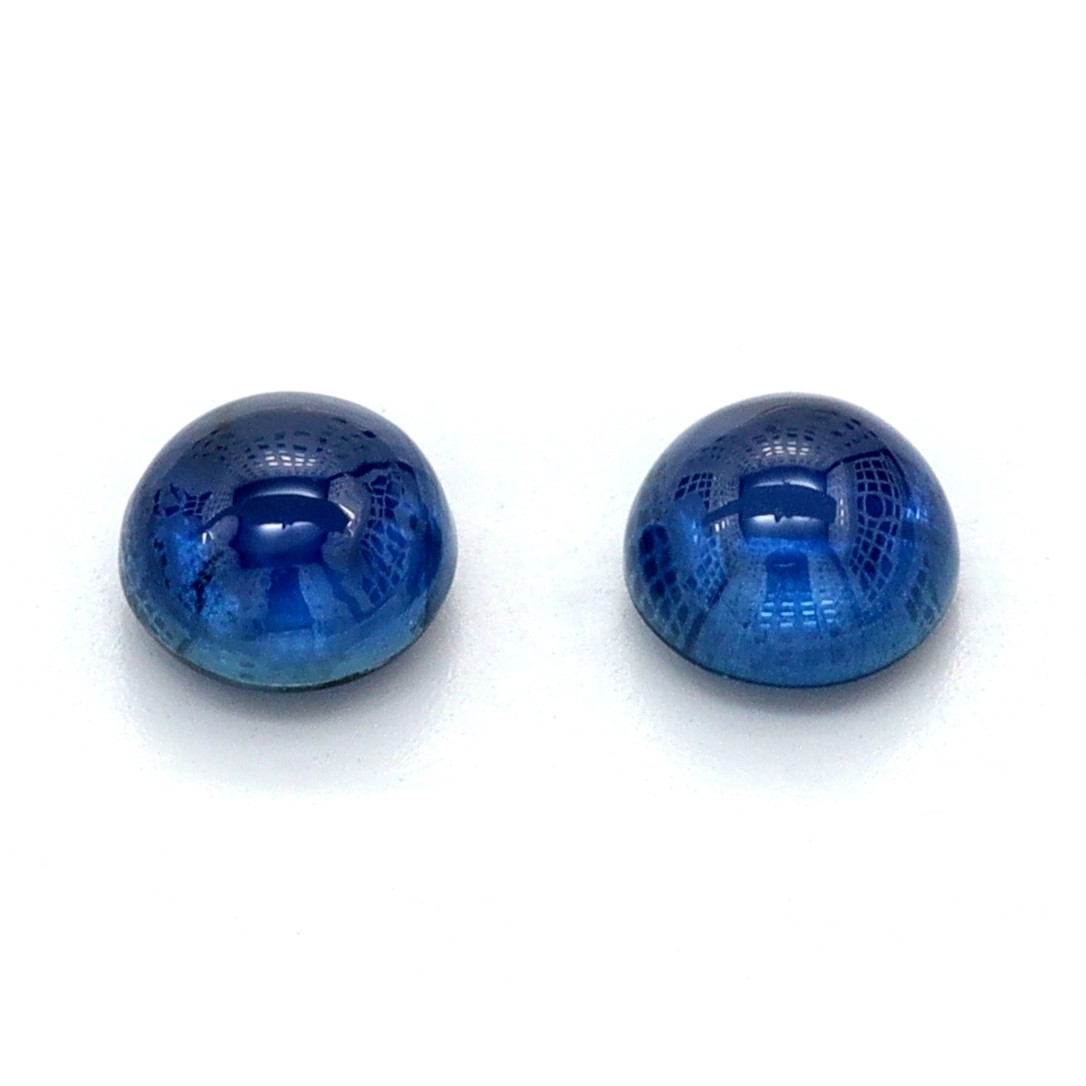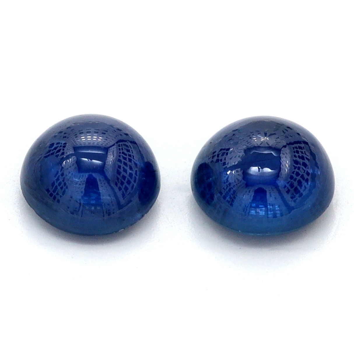 No certificate Matching set Stock ID: TSRC2508042.34ct Blue Cabochon Thailand SapphireCarat: 2.34 ctType: SapphireCut: CabochonColour: BlueOrigin: ThailandComment: Not Heated3.51 x 3.65 x 2.00 mm