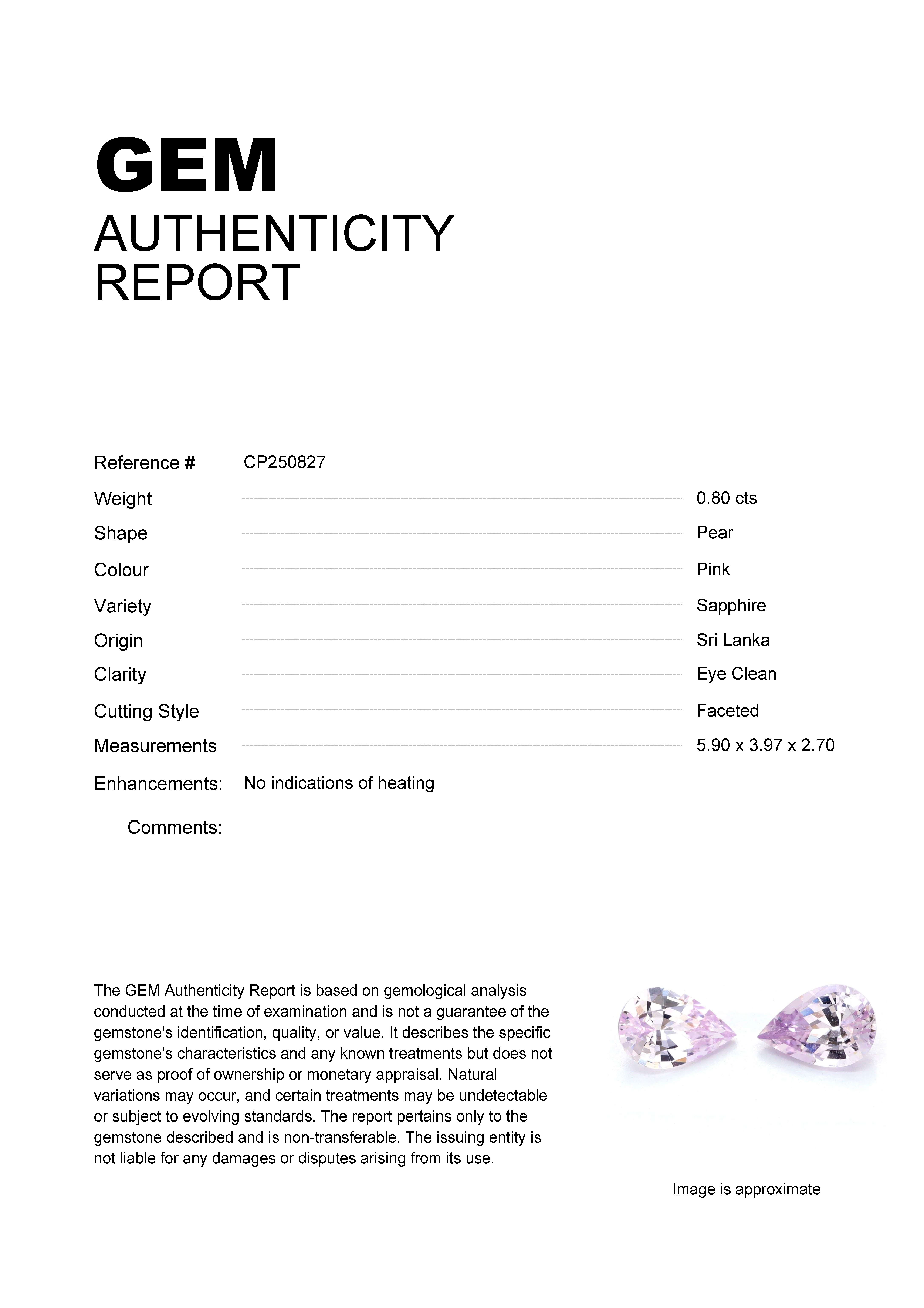 0.80ct Pink Pear Sri Lanka SapphireCarat: 0.80 ctType: SapphireCut: PearColour: PinkOrigin: Sri LankaComment: Not Heated5.90 x 3.97 x 2.70 mm