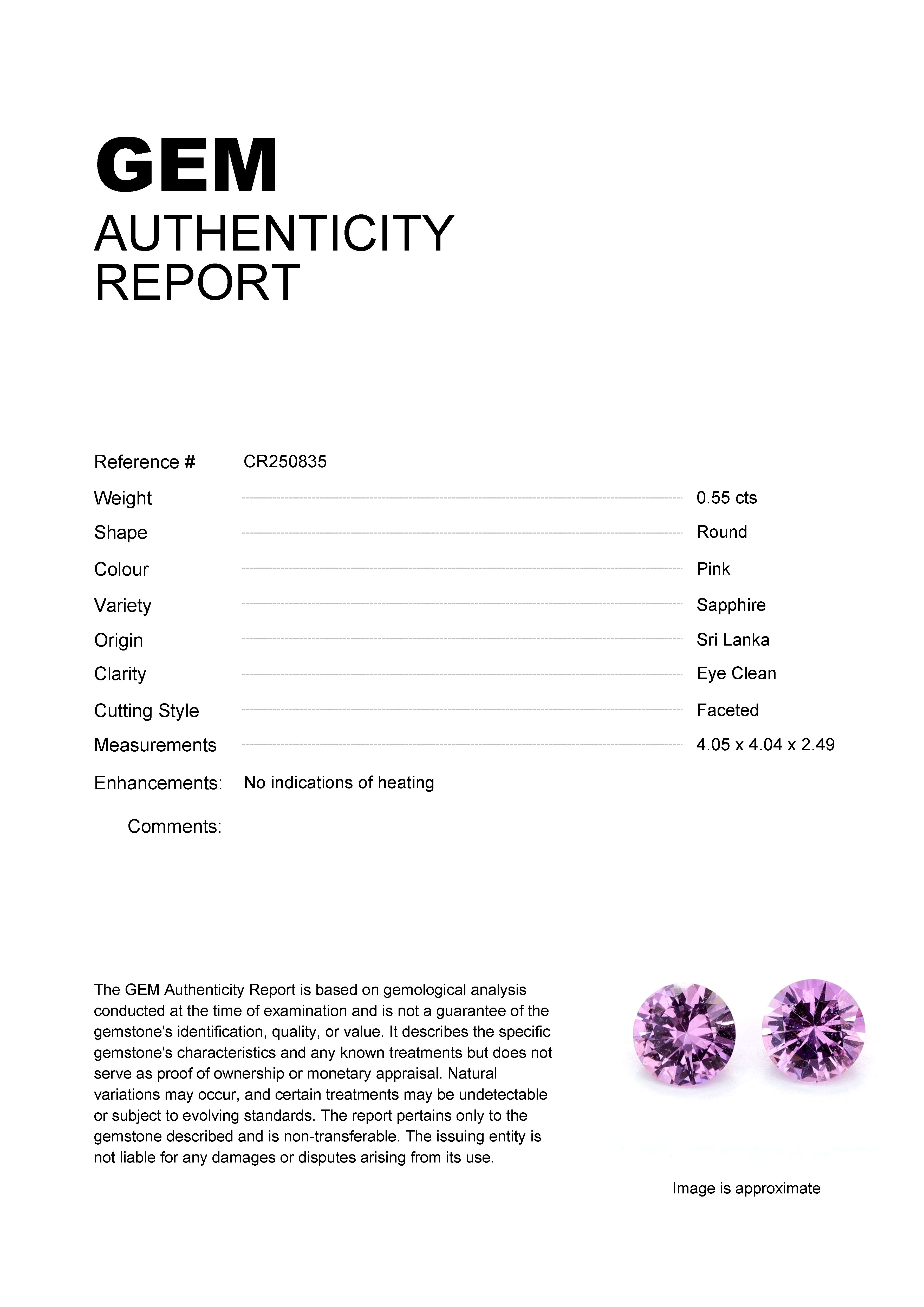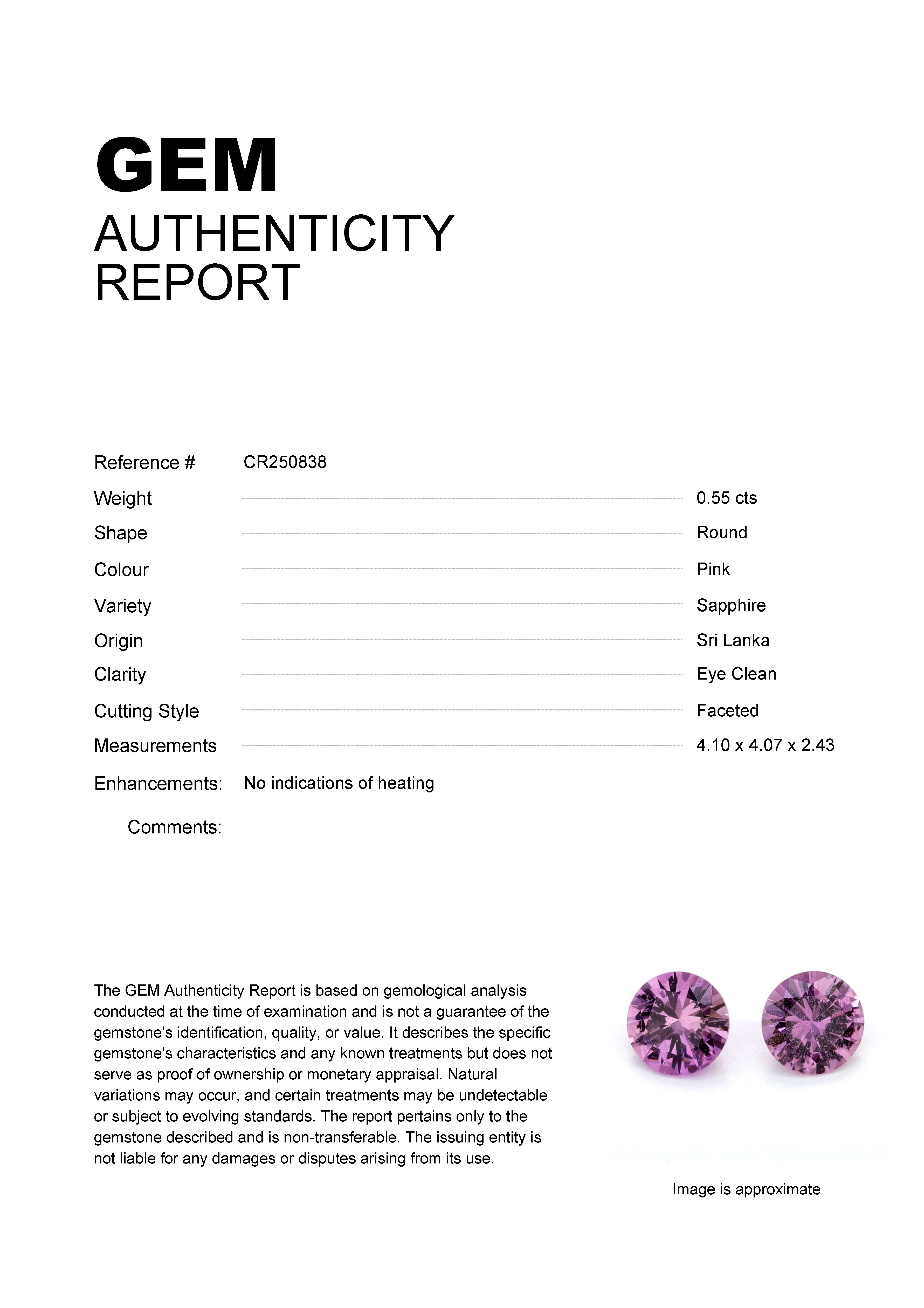 0.55ct Pink Round Sri Lanka SapphireCarat: 0.55 ctType: SapphireCut: RoundColour: PinkOrigin: Sri LankaComment: Not Heated4.10 x 4.07 x 2.43 mm