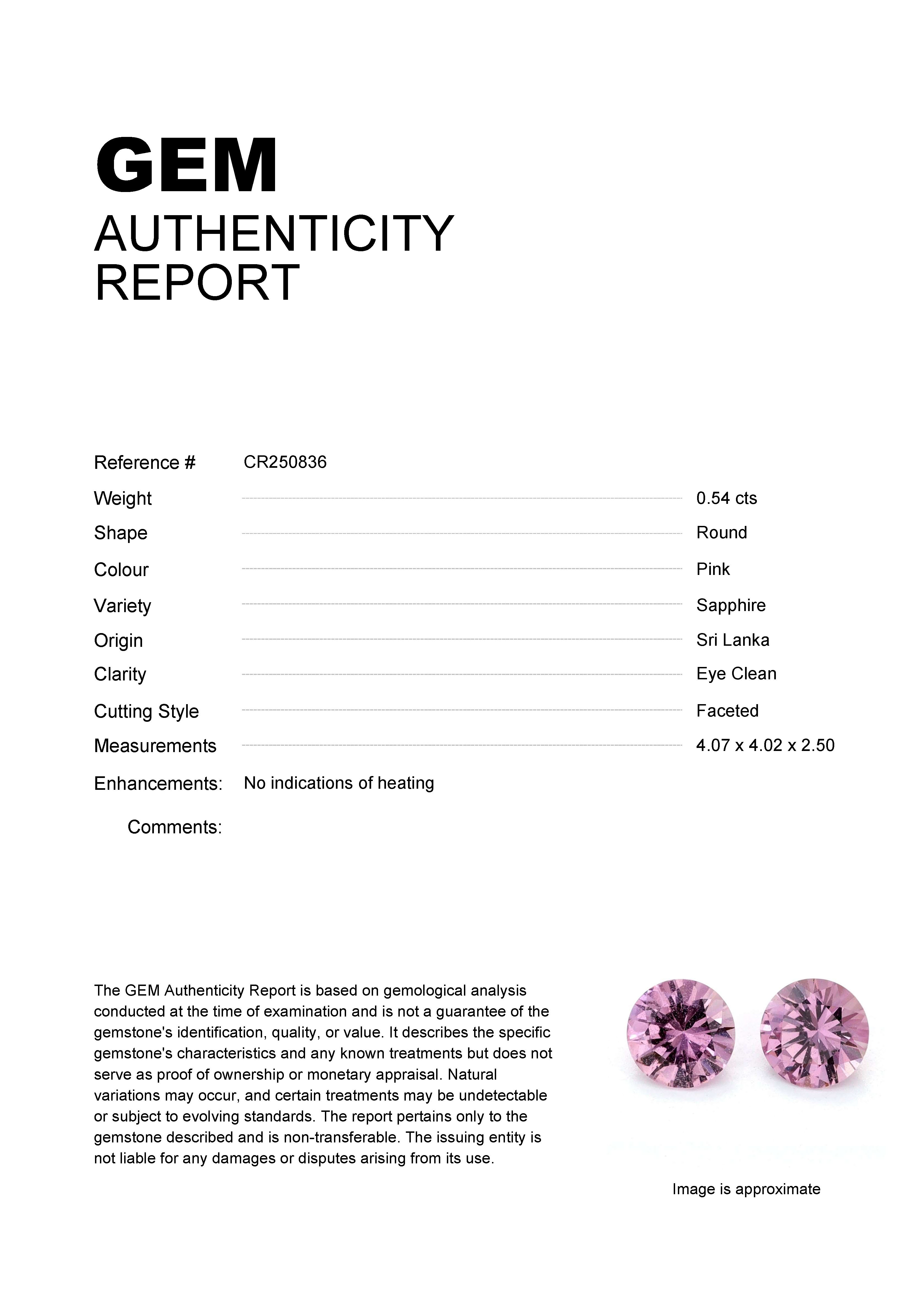 0.54ct Pink Round Sri Lanka SapphireCarat: 0.54 ctType: SapphireCut: RoundColour: PinkOrigin: Sri LankaComment: Not Heated4.07 x 4.02 x 2.50 mm