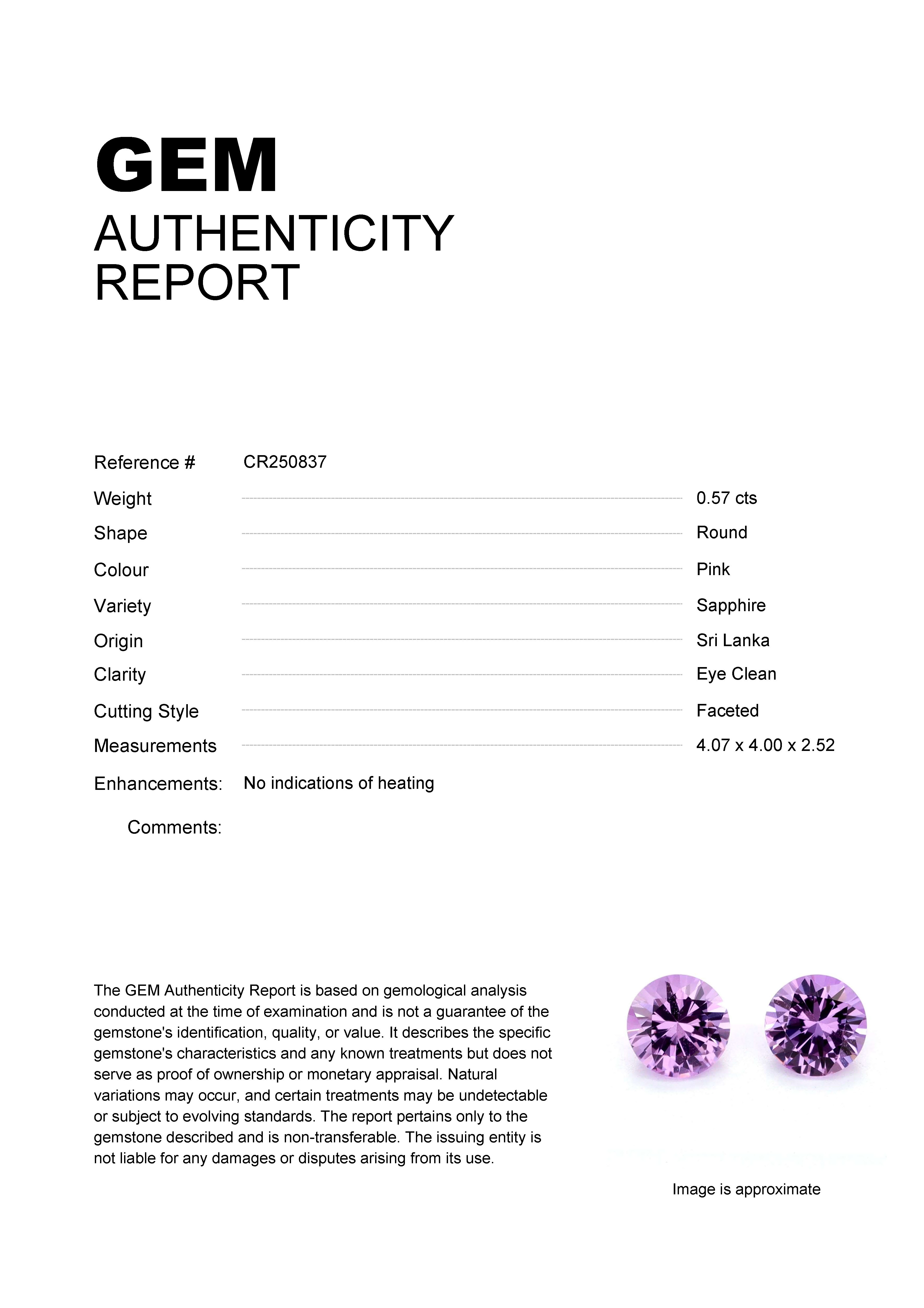 0.57ct Pink Round Sri Lanka SapphireCarat: 0.57 ctType: SapphireCut: RoundColour: PinkOrigin: Sri LankaComment: Not Heated4.07 x 4.00 x 2.52 mm