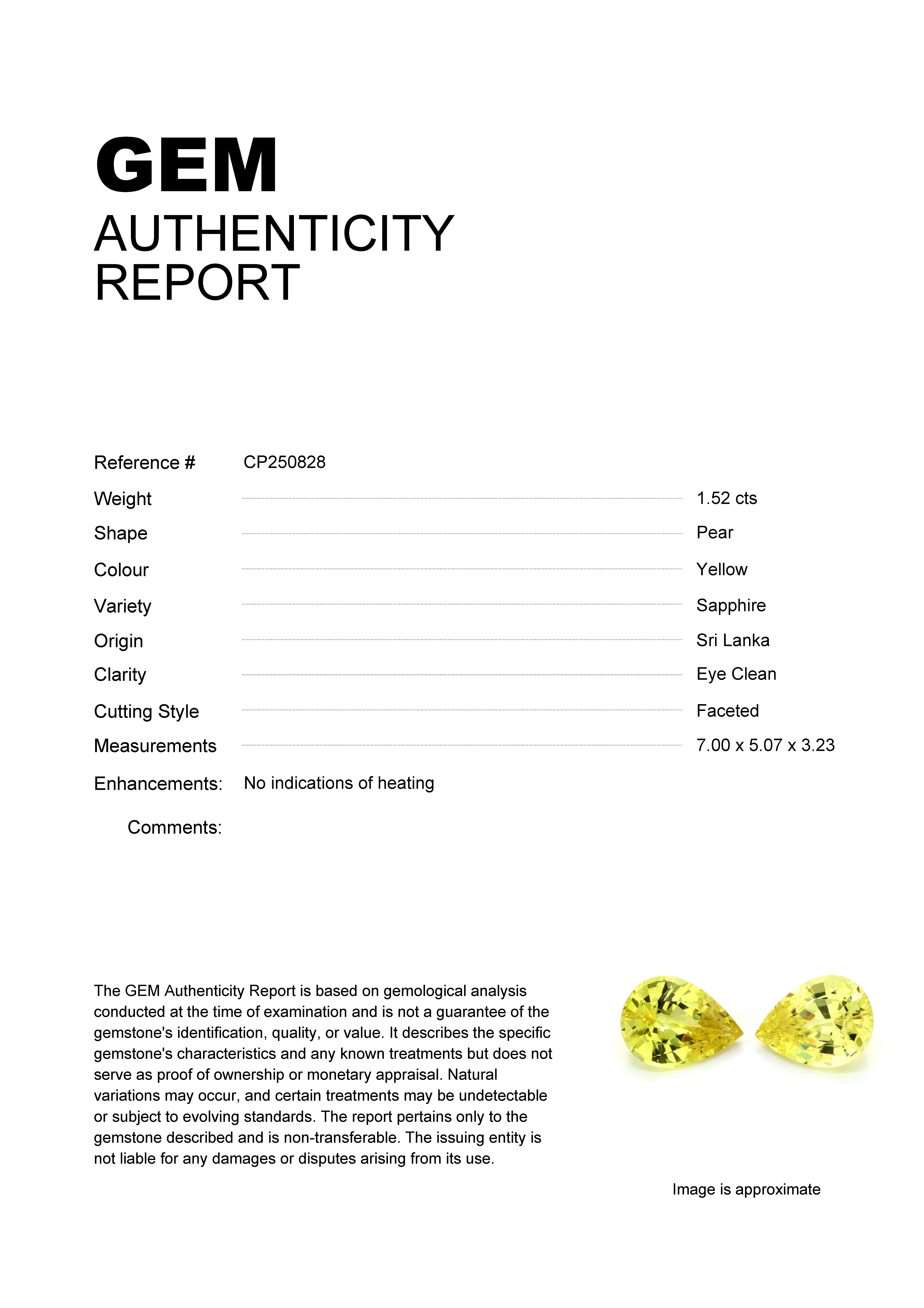 1.52ct Yellow Pear Sri Lanka SapphireCarat: 1.52 ctType: SapphireCut: PearColour: YellowOrigin: Sri LankaComment: Not Heated7.00 x 5.07 x 3.23 mm