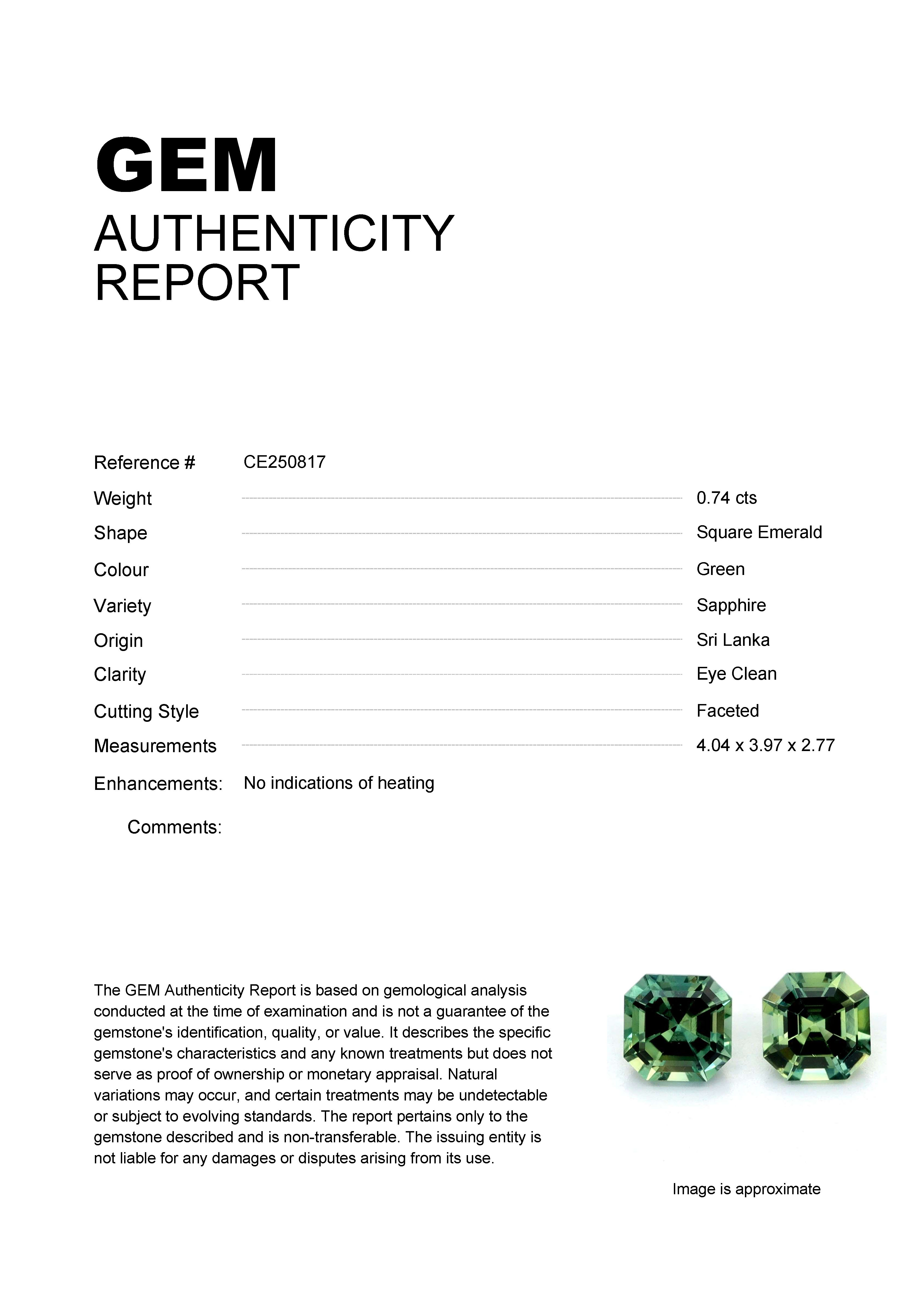 0.74ct Green Square Emerald Sri Lanka SapphireCarat: 0.74 ctType: SapphireCut: Square EmeraldColour: GreenOrigin: Sri LankaComment: Not Heated4.04 x 3.97 x 2.77 mm