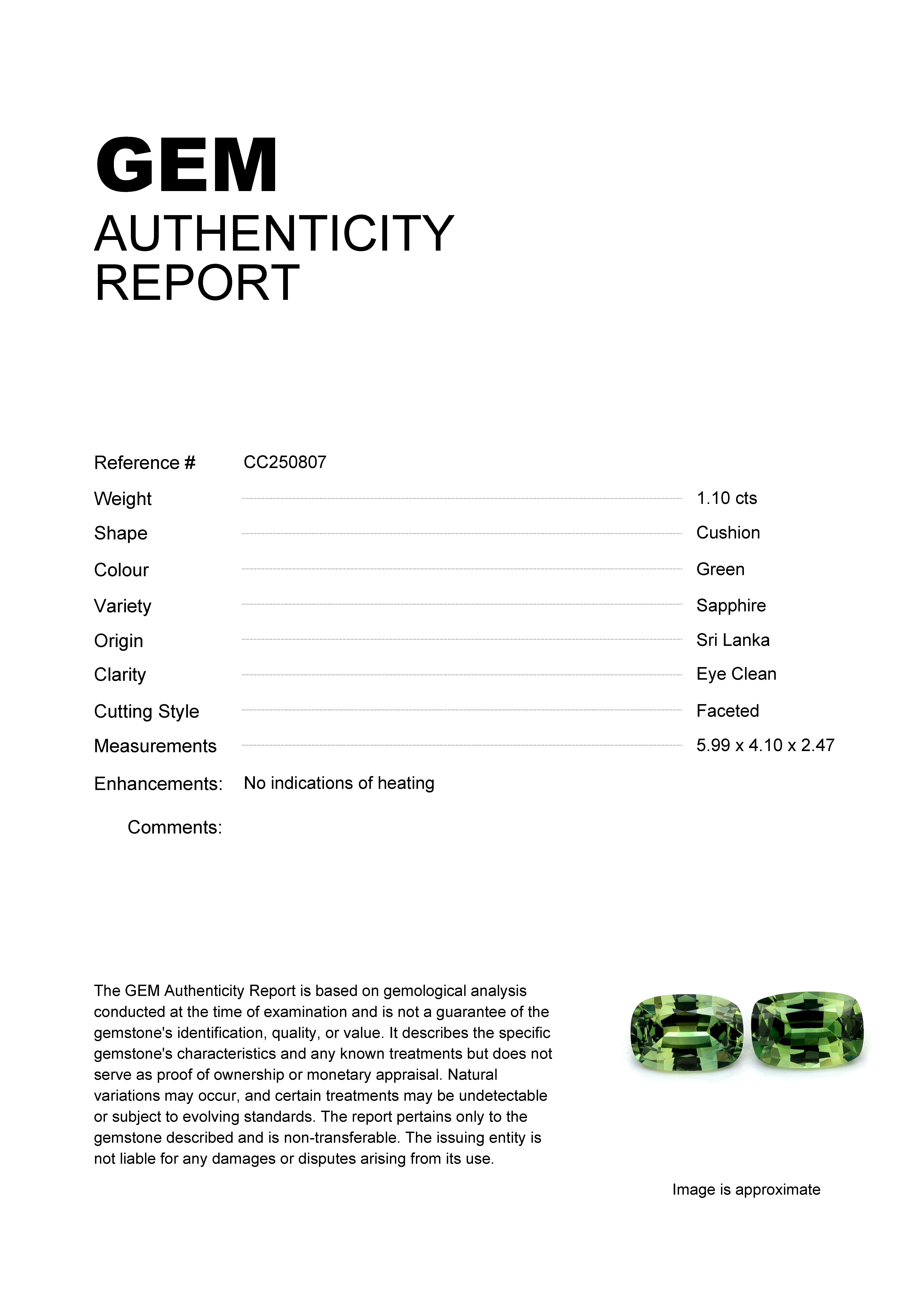 1.10ct Green Cushion Sri Lanka SapphireCarat: 1.10 ctType: SapphireCut: CushionColour: GreenOrigin: Sri LankaComment: Not Heated5.99 x 4.10 x 2.47 mm