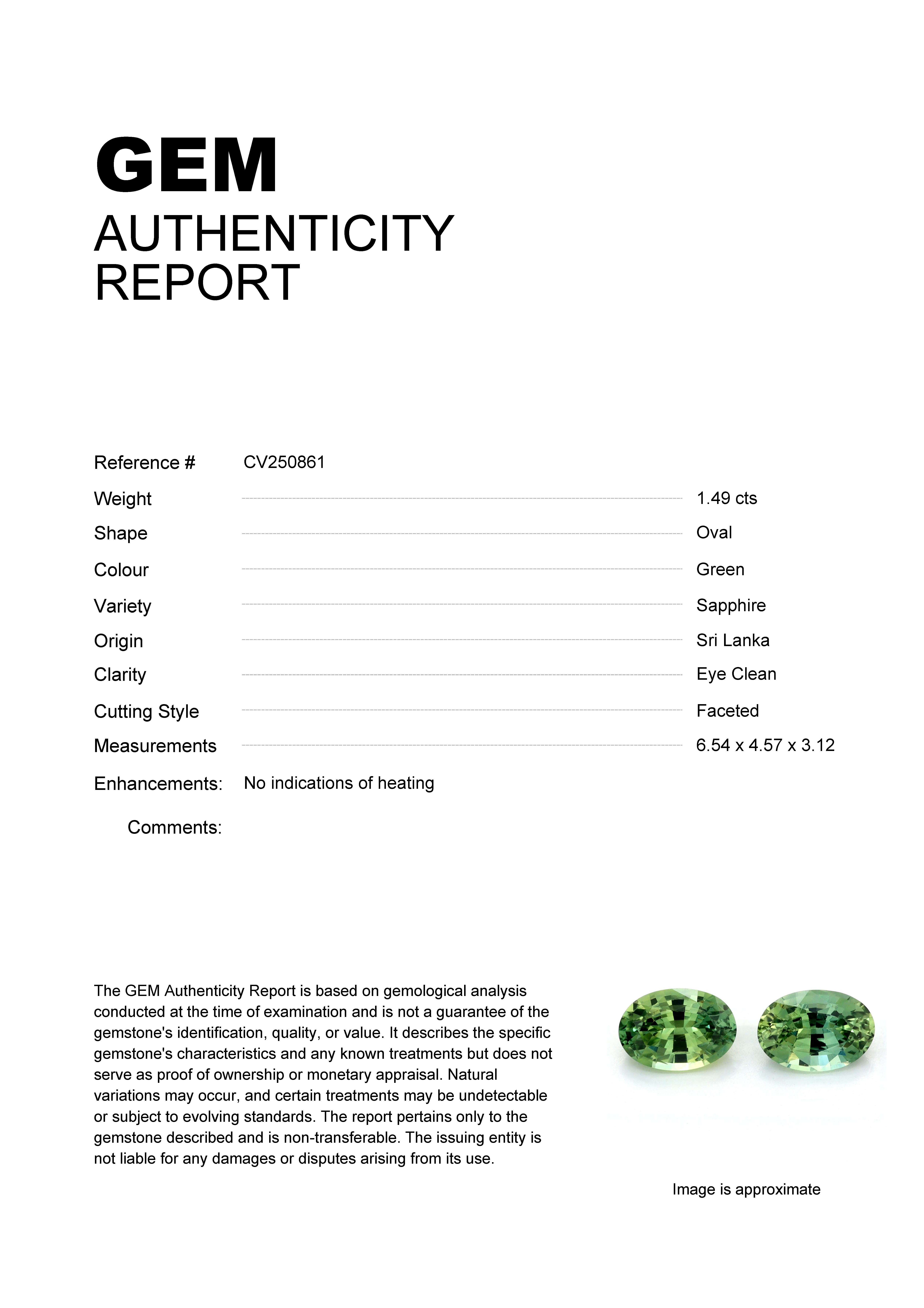 1.49ct Green Oval Sri Lanka SapphireCarat: 1.49 ctType: SapphireCut: OvalColour: GreenOrigin: Sri LankaComment: Not Heated6.54 x 4.57 x 3.12 mm