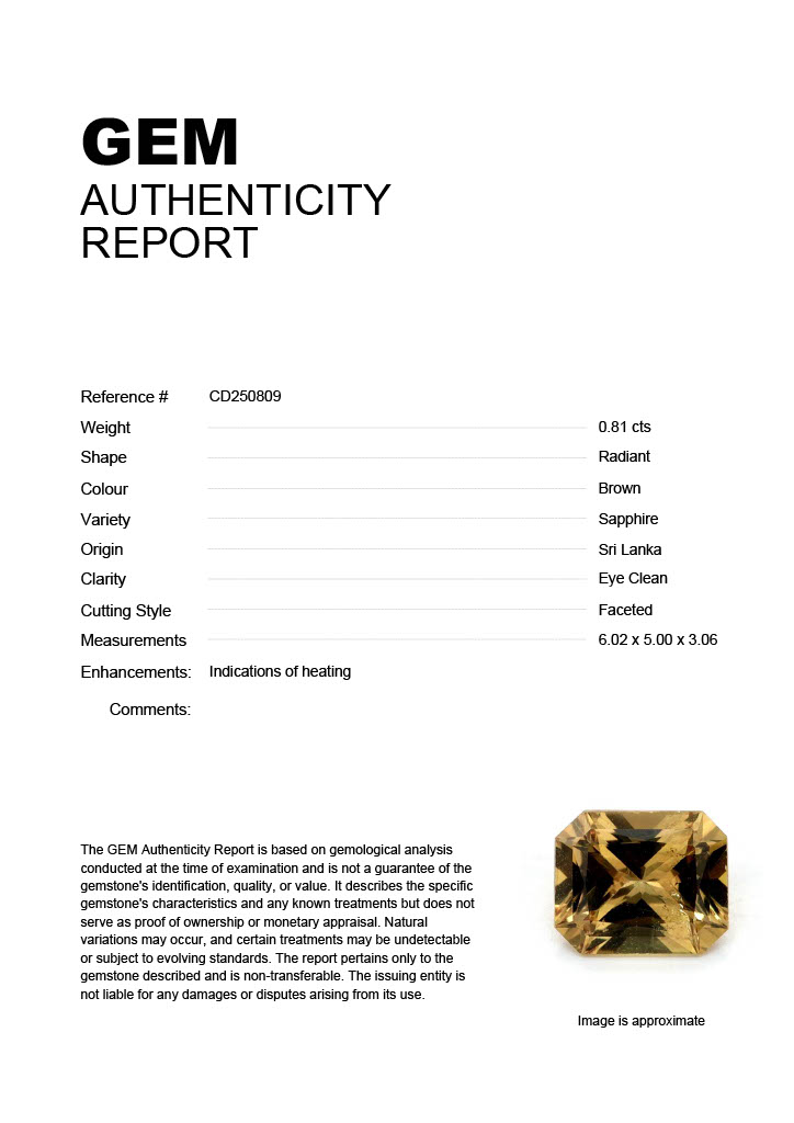 0.81ct Brown Radiant Sri Lanka SapphireCarat: 0.81 ctType: SapphireCut: RadiantColour: BrownOrigin: Sri LankaComment: Heated6.02 x 5.00 x 3.06 mm