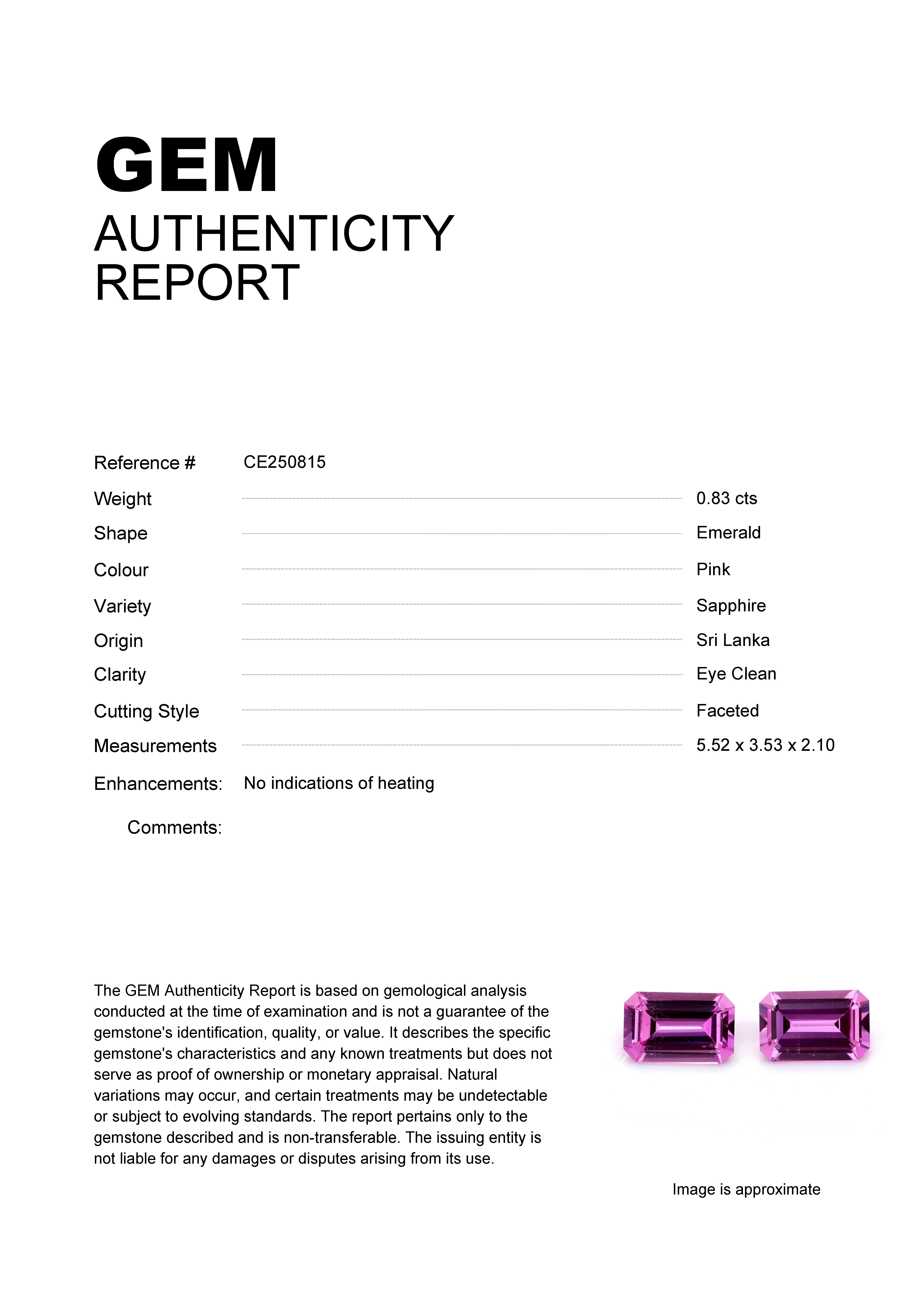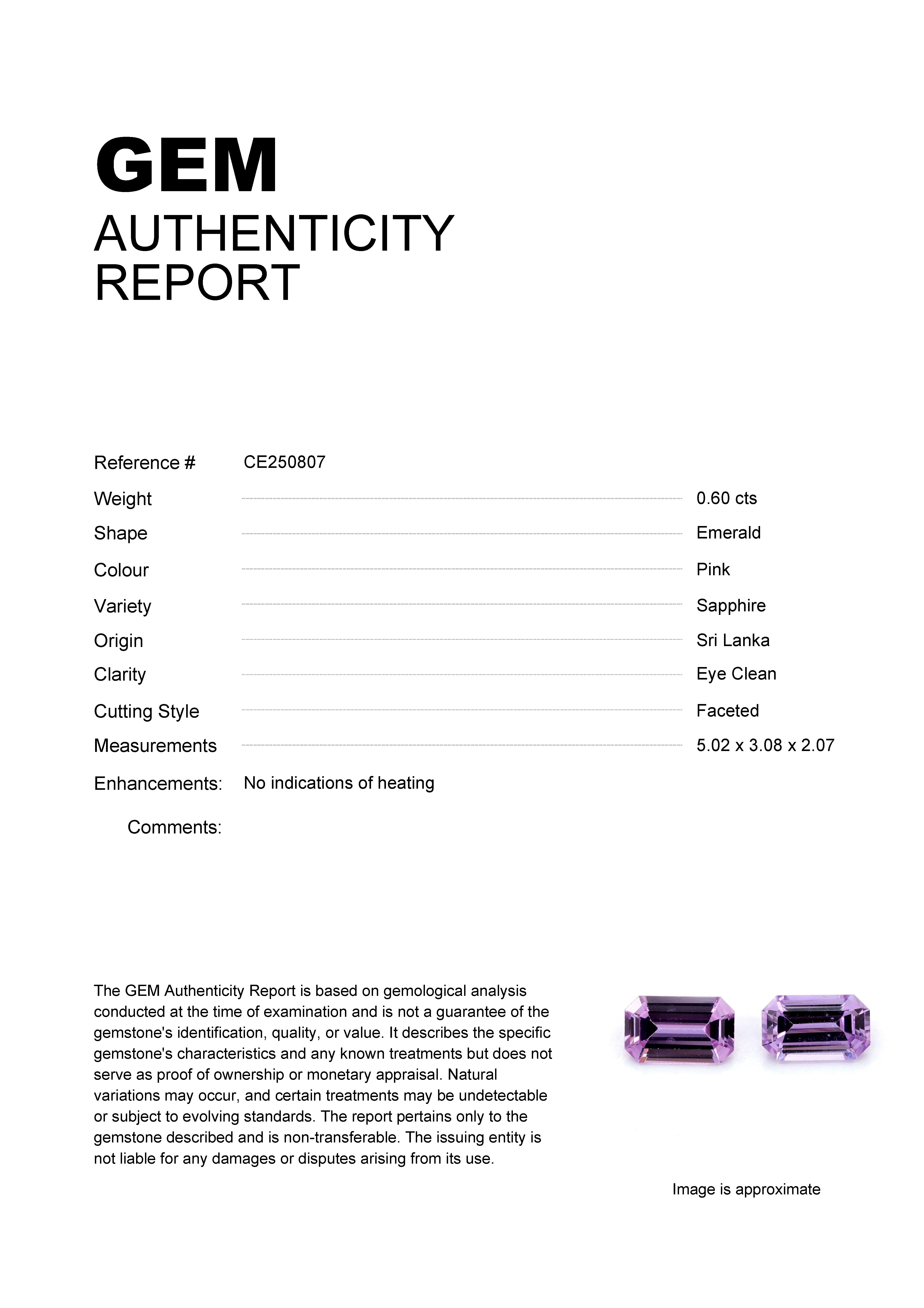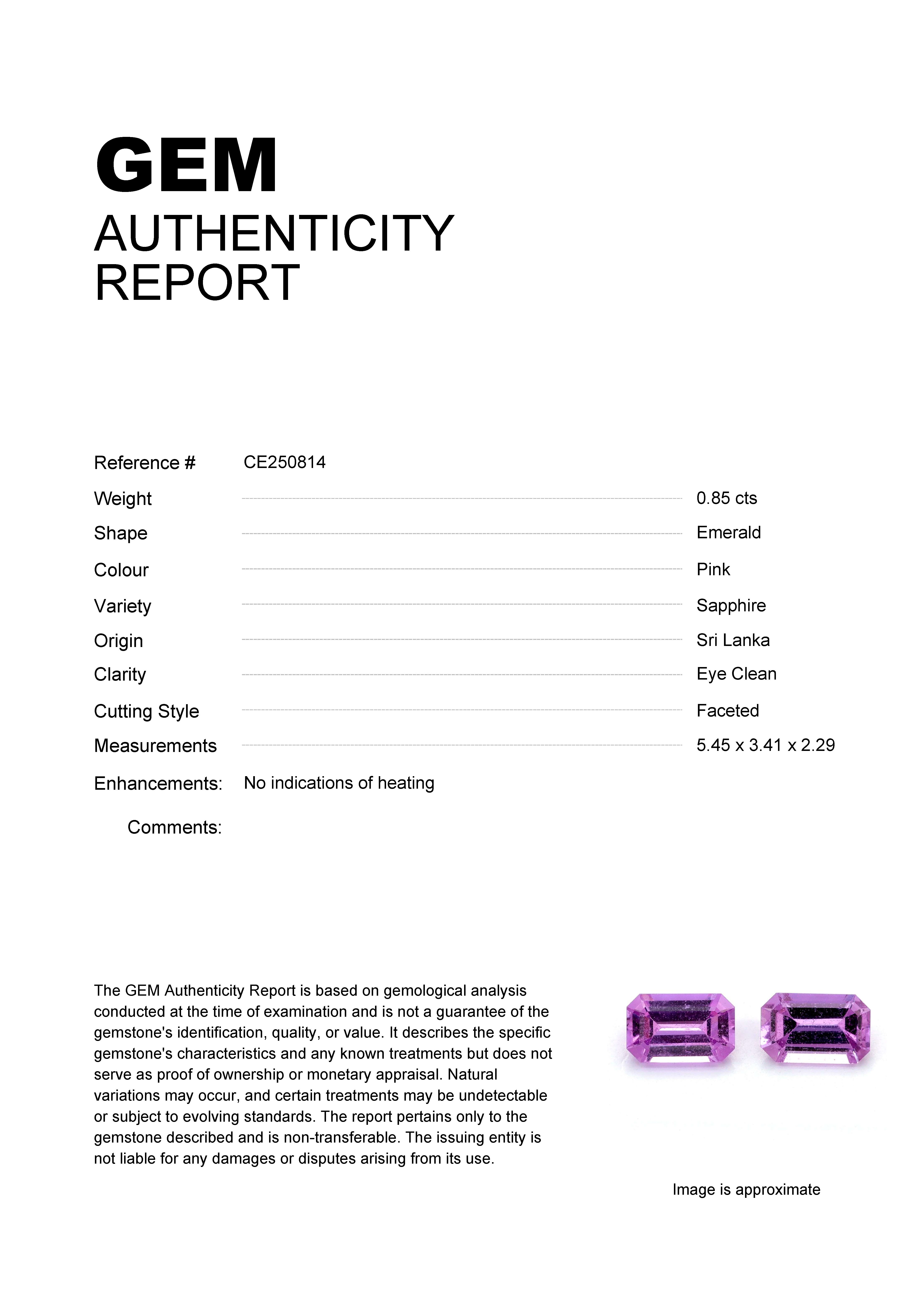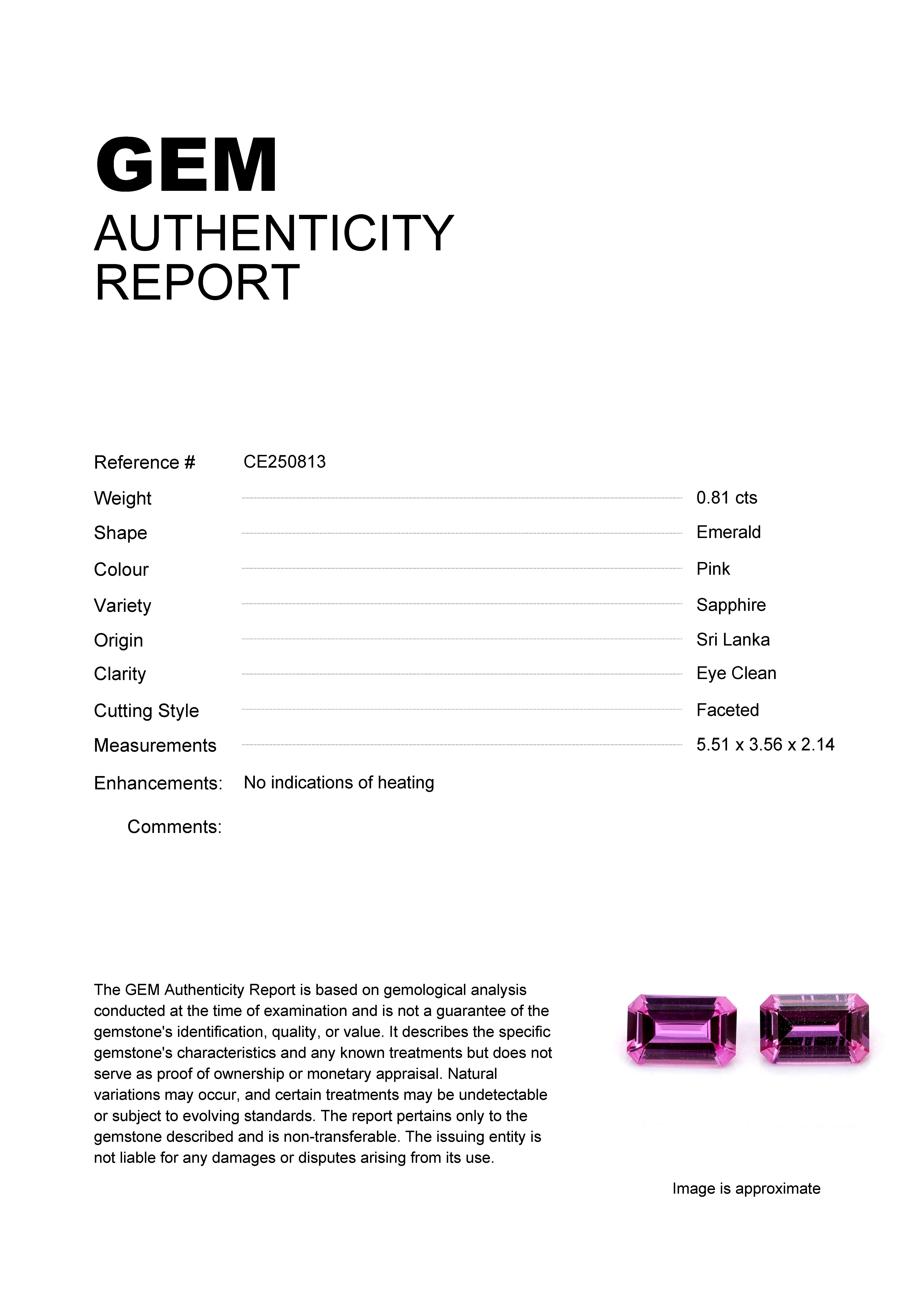 0.85ct Pink Emerald Sri Lanka SapphireCarat: 0.85 ctType: SapphireCut: EmeraldColour: PinkOrigin: Sri LankaComment: Not Heated5.45 x 3.41 x 2.29 mm