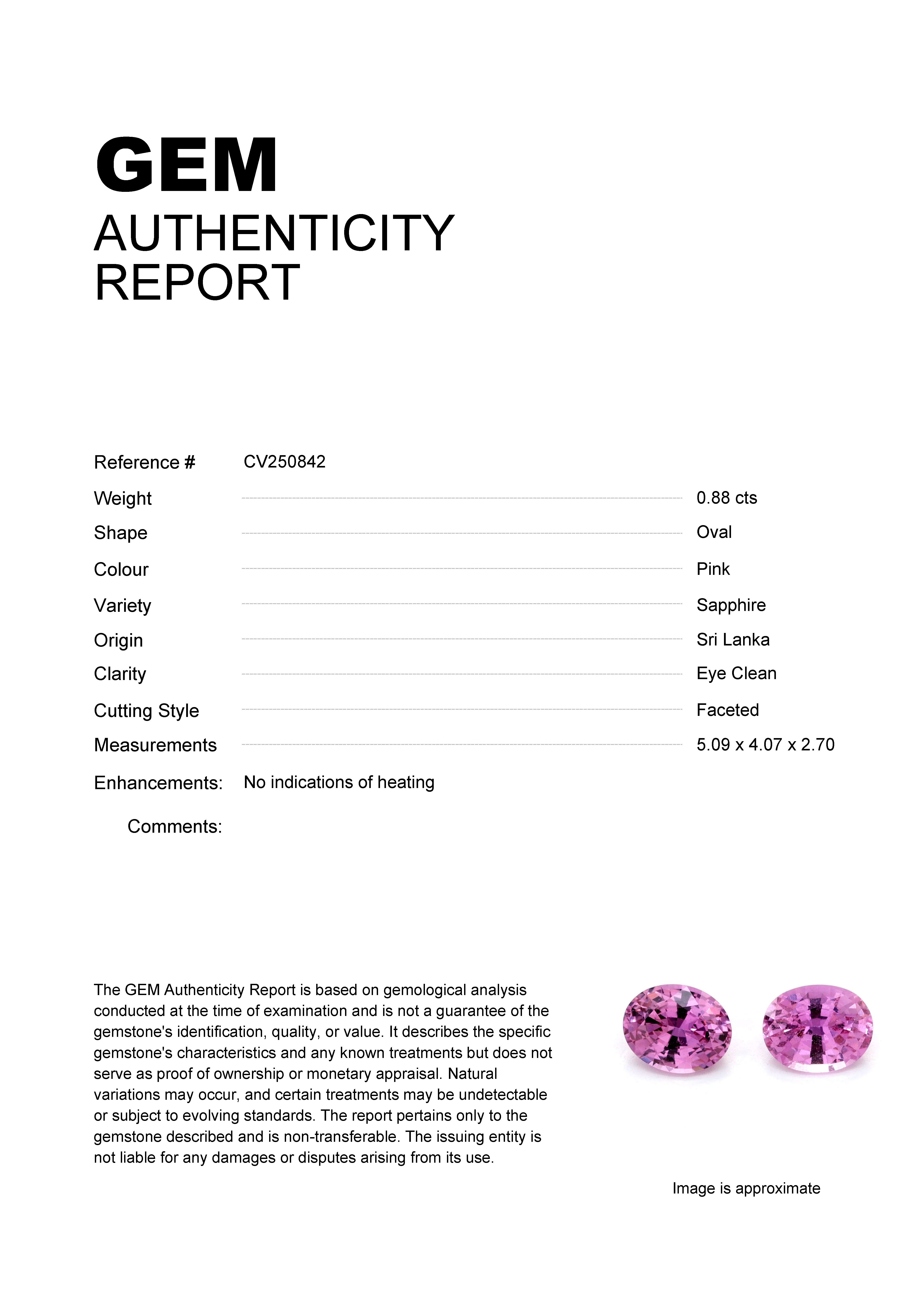 0.88ct Pink Oval Sri Lanka SapphireCarat: 0.88 ctType: SapphireCut: OvalColour: PinkOrigin: Sri LankaComment: Not Heated5.09 x 4.07 x 2.70 mm
