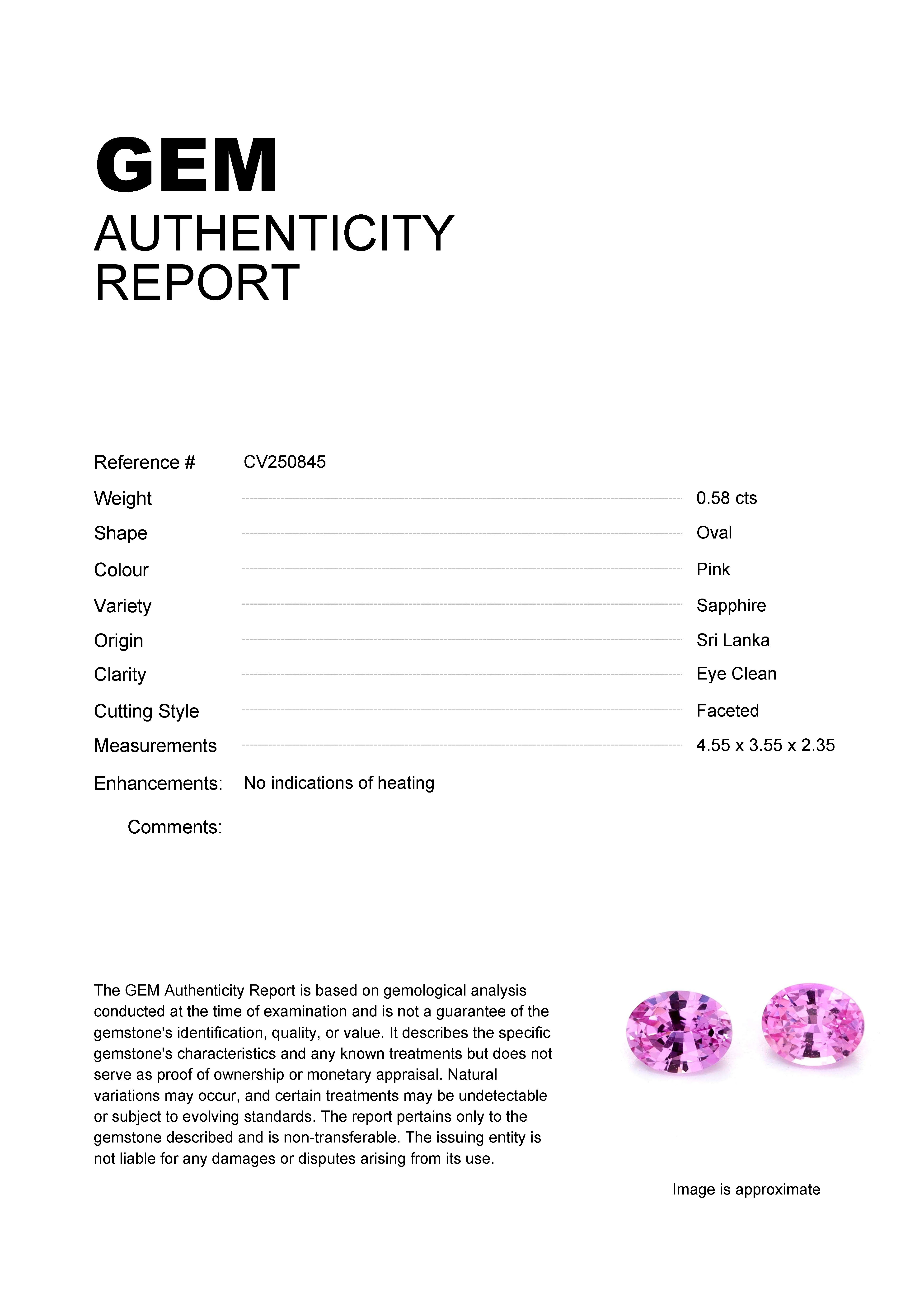0.58ct Pink Oval Sri Lanka SapphireCarat: 0.58 ctType: SapphireCut: OvalColour: PinkOrigin: Sri LankaComment: Not Heated4.55 x 3.55 x 2.35 mm