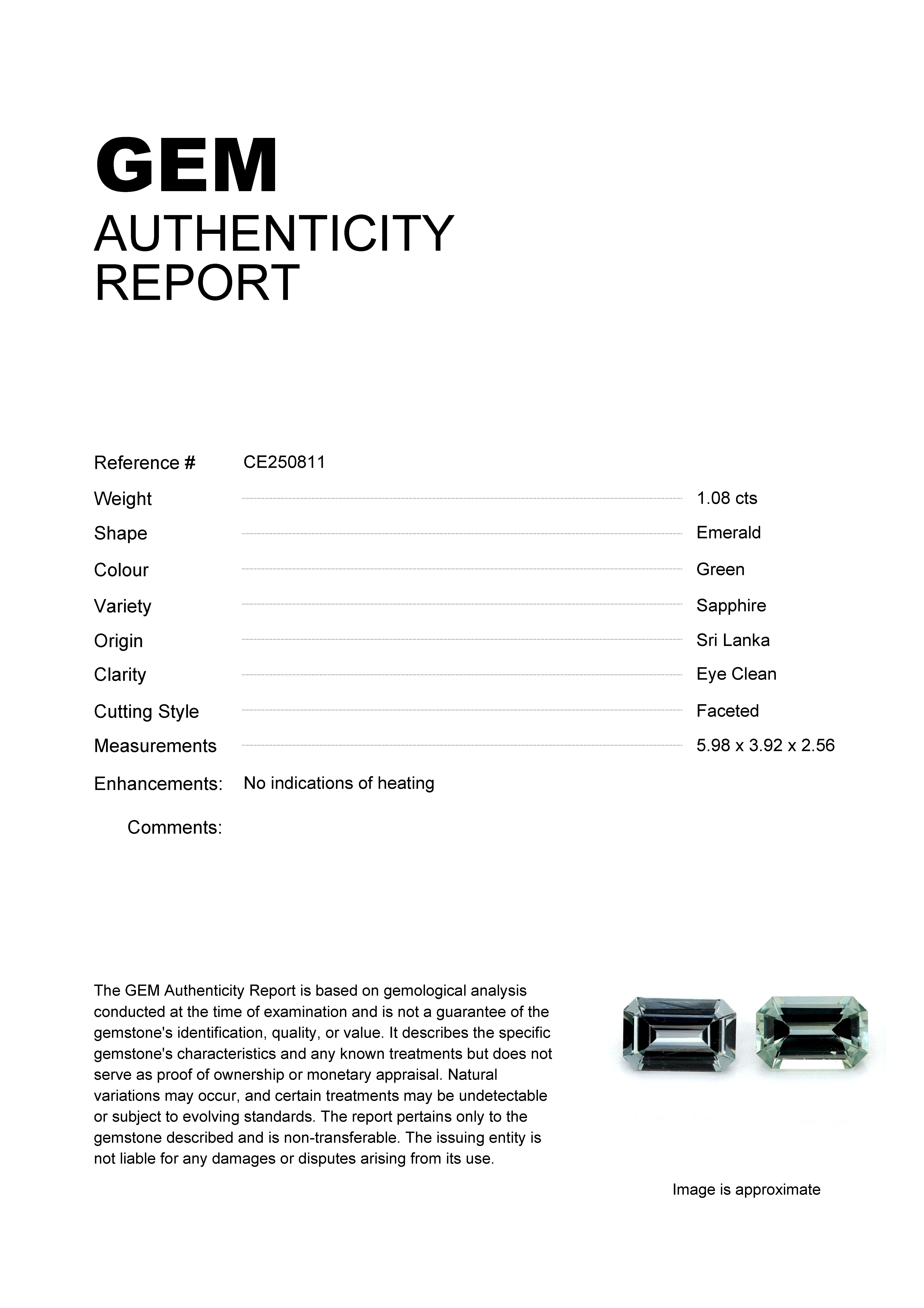 1.08ct Green Emerald Sri Lanka SapphireCarat: 1.08 ctType: SapphireCut: EmeraldColour: GreenOrigin: Sri LankaComment: Not Heated5.98 x 3.92 x 2.56 mm