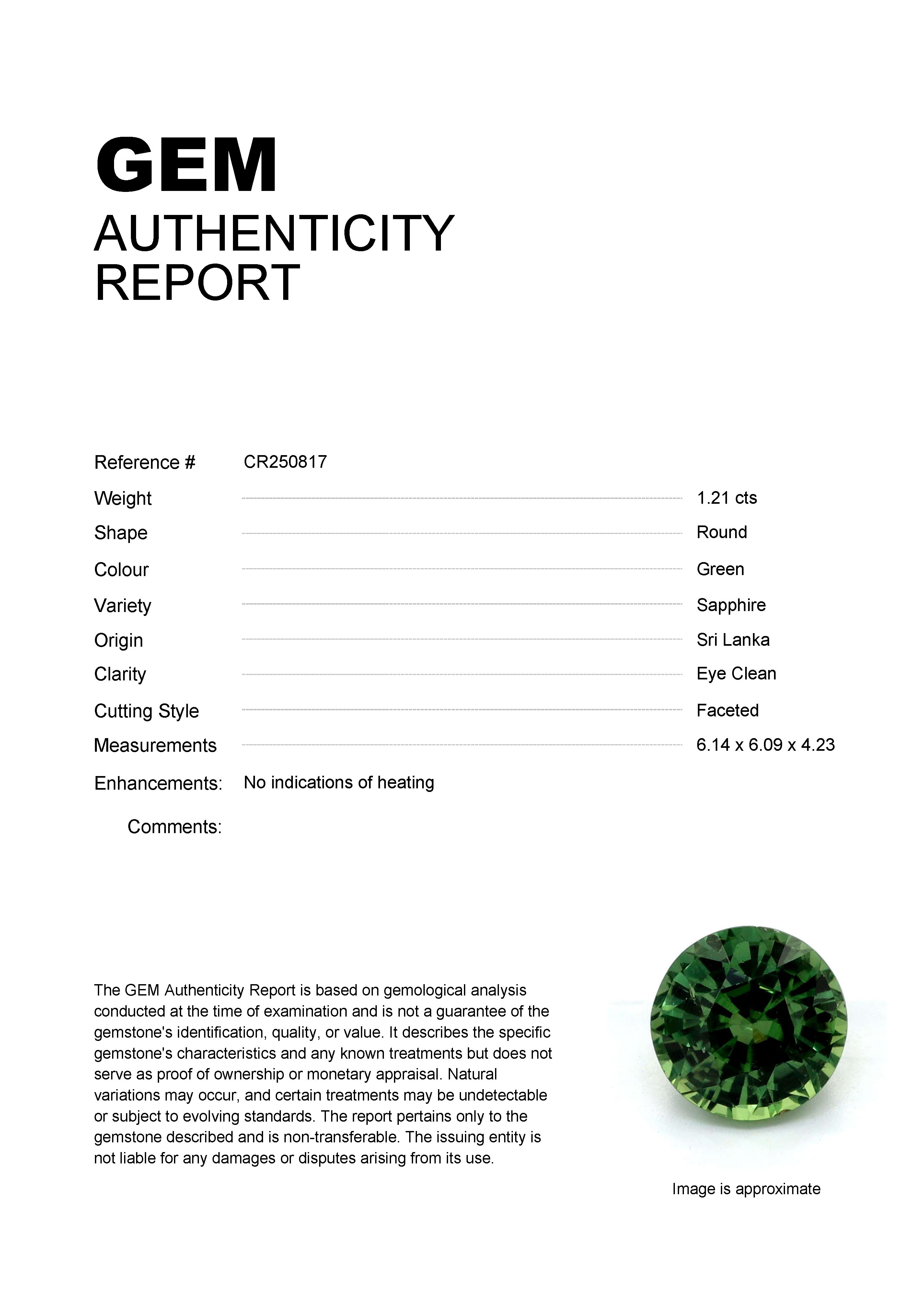 1.21ct Green Round Sri Lanka SapphireCarat: 1.21 ctType: SapphireCut: RoundColour: GreenOrigin: Sri LankaComment: Not Heated6.14 x 6.09 x 4.23 mm